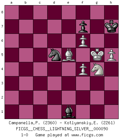 Last move : 1-0 2011 January 22 21:11:39 [Event "FICGS__CHESS__LIGHTNING_SILVER__000090"] [Site "FICGS"] [Date "2011.01.22"] [Round "1"] [White "Campanella,Paul"] [Black "Kotlyanskiy,Edward"] [Result "1-0"] [WhiteElo "2360"] [BlackElo "2261"] 1.d4 d5 2.c4 Nf6 3.cxd5 e6 4.dxe6 Bxe6 5.Nf3 c5 6.e3 Nc6 7.Nc3 Be7 8.dxc5 Qxd1+ 9.Nxd1 Bxc5 10.Nc3 O-O 11.Be2 Rfd8 12.O-O Bb4 13.Bd2 a6 14.Rfd1 h6 15.Be1 Be7 16.a3 Rd7 17.b4 Rc7 18.Rab1 Rac8 19.b5 Nd8 20.bxa6 bxa6 21.Na4 Bf5 22.Nb6 Rb8 23.Nd5 Rxb1 24.Nxc7 Rxd1 25.Bxd1 Bxa3 26.Nxa6 Nc6 27.Nc7 Kf8 28.Bb3 Bc5 29.Bc3 Bg6 30.Nd5 Nd7 31.Ba4 Ncb8 32.Nf4 Be4 33.Nd4 g5 34.Nh5 Bg6 35.g4 Ne5 36.h3 Nbd7 37.Nf5 Bxf5 38.gxf5 Ke7 39.Kg2 Kd6 40.Bb3 Ke7 41.f6+ Kf8 42.Ng3 Bb6 43.Nf5 h5 44.Ng3 Bd8 45.f4 gxf4 46.exf4 Nd3 47.Nxh5 N7c5 48.Bd5 Na4 49.Bd2 Nb6 50.Ba2 Nd7 51.Bb1 N3c5 52.Bb4 Kg8 53.Kg3 Ne6 54.Be7 Bb6 55.Kg4 Bd4 56.Ba2 Bb2 57.h4 Nef8 58.Bd5 Bc3 59.Bc6 Nb8 60.Bb5 Nbd7 61.Bxd7 Nxd7 62.Kg5 Nb6 63.Ng3 Kh7 64.Nf5 Be1 65.Nd4 Kg8 66.Nf3 Bc3 67.Ne5 Bd2 68.Ng4 Kh7 69.Bd6 Nd5 70.Be5 Be1 71.h5 1-0 QGD : Marshall defense Kingside Castling by player Black (move 10) Kingside Castling by player White (move 12) 10 pieces endgame at move 61 : White KBNPPP , Black KBNP WHITE : King + 1 Bishop 1 Knight 3 Pawns BLACK : King + 1 Bishop 1 Knight 1 Pawn Player White won this chess game. Follow this game move after move (download)There's never before been a Chess player with such a thorough knowledge of the intricacies of the game and such an absolutely indomitable will to win. I think Bobby is the greatest player that ever lived. (Lisa Lane) Schach ist ein Kampf gegen den Fehler. (Johannes Herrman Zukertort) Tu no necesitas jugar muy bien, únicamente ayudar a tu oponenet a que juegue muy mal. (Genrikh Chepukaitis) Il (Jacob Murray) ne joue pas pour le bon coup, mais pour le meilleur. (Eloi Relange) Two beer, or not two beer. (Unknown)