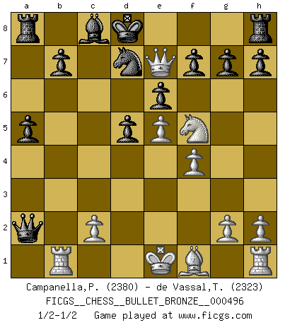 Last move : 1/2-1/2 2011 January 22 21:23:9 [Event "FICGS__CHESS__BULLET_BRONZE__000496"] [Site "FICGS"] [Date "2011.01.22"] [Round "1"] [White "Campanella,Paul"] [Black "de Vassal,Thibault"] [Result "1/2-1/2"] [WhiteElo "2380"] [BlackElo "2323"] 1.e4 e6 2.d4 d5 3.Nc3 Nf6 4.e5 Nfd7 5.f4 c5 6.Nf3 Nc6 7.Be3 cxd4 8.Nxd4 Bc5 9.Qd2 Nxd4 10.Bxd4 Bxd4 11.Qxd4 Qb6 12.Qd2 Qxb2 13.Rb1 Qa3 14.Nb5 Qxa2 15.Nd6+ Ke7 16.Qb4 a5 17.Nf5+ Kd8 18.Qe7+ Kc7 19.Qd6+ Kd8 20.Qe7+ Kc7 21.Qd6+ Kd8 22.Qe7+ 1/2-1/2 French : Steinitz, Boleslavsky variation This chess game ended in a draw. Follow this game move after move (download)Tactics flow from a superior position. (Bobby Fischer) Irgendwie scheint mir sonntags früh um 9 Uhr der Killerinstinkt verloren gegangen zu sein. (Alexej Shirov) Los Peones son nacidos libres, y aún así, se encuentran por doquier encadenados. (Rick Kennedy) Si rien de grave n'est détecté lors de l'analyse d'une position, on joue alors le coup. Seconde règle de Blumenfeld. Beta. Software undergoes beta testing shortly before it's released. Beta is latin for still doesn't work. (Anonymous)