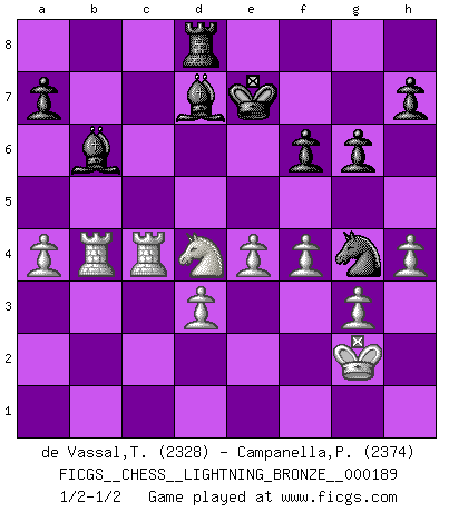 Last move : 1/2-1/2 2011 January 22 22:31:17 [Event "FICGS__CHESS__LIGHTNING_BRONZE__000189"] [Site "FICGS"] [Date "2011.01.22"] [Round "1"] [White "de Vassal,Thibault"] [Black "Campanella,Paul"] [Result "1/2-1/2"] [WhiteElo "2328"] [BlackElo "2374"] 1.c4 e5 2.g3 Nf6 3.Bg2 d5 4.cxd5 Nxd5 5.Nc3 Nb6 6.Nf3 Nc6 7.O-O Be7 8.d3 O-O 9.Be3 Bg4 10.Rc1 Qd7 11.a3 f6 12.Nd2 Be6 13.Na4 Nd4 14.Bxd4 exd4 15.Bxb7 Qxa4 16.Qxa4 Nxa4 17.Bxa8 Rxa8 18.Rxc7 Kf8 19.Rc6 Bd7 20.Rc2 Bd8 21.Rfc1 Rb8 22.Nf3 Bb6 23.Rc4 Nxb2 24.Rb4 Na4 25.Nxd4 Re8 26.Rc2 Nc5 27.Kg2 Ke7 28.Rbc4 Kd6 29.Nf3 Nb3 30.Rb4 Be6 31.Rc3 Nc5 32.Nd4 Bd7 33.e4 g6 34.f3 Rd8 35.Nc2 Ne6 36.R3c4 Ng5 37.h4 Nf7 38.f4 Nh6 39.Nd4 Ke7 40.a4 Ng4 41.Kf3 Nh2+ 42.Kg2 Ng4 1/2-1/2 English Opening Kingside Castling by player White (move 7) Kingside Castling by player Black (move 8) This chess game ended in a draw. Follow this game move after move (download)No price is too great for the scalp of the enemy King. (Koblentz) Fallen sollten polizeilich verboten werden. (Savielly Grigorievitsch Tartakower) En partidas rápidas, el Caballo es mas poderoso que el Alfil. (Vlastimil Hort) La vérité est comme le meilleur coup aux échecs : elle existe, mais il faut la chercher. (Arturo Perez-Reverte) Nothing is more important for teaching us to understand the concepts we have than constructing fictitious ones. (Ludwig Wittgenstein)