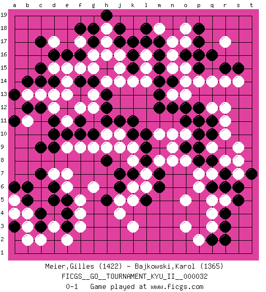 Last move : 0-1 2011 January 27 21:58:29 [Event "FICGS__GO__TOURNAMENT_KYU_II__000032"] [Site "FICGS"] [Date "2011.01.24"] [Round "1"] [Black "Meier,Gilles"] [White "Bajkowski,Karol"] [Result "0-1"] [Rating 1 "1422"] [Rating 2 "1365"] 1.q16 d3 2.d16 q4 3.d5 f4 4.c3 c2 5.c4 b2 6.c9 k3 7.r6 r8 8.r3 q3 9.r4 q5 10.q6 r5 11.s5 p6 12.r2 p7 13.k16 q14 14.r15 o17 15.p17 o15 16.c14 e6 17.d6 e7 18.o16 n16 19.p16 l15 20.k15 k14 21.m15 l14 22.m16 n15 23.m14 l16 24.m17 n17 25.l17 j14 26.h16 r14 27.m12 r17 28.p18 f17 29.f16 d17 30.c17 g16 31.g17 g15 32.h15 h17 33.g18 h14 34.g14 f15 35.f14 e15 36.e16 j16 37.j17 j15 38.k17 h18 39.f18 d15 40.c15 n13 41.m13 m10 42.n12 o10 43.p15 p14 44.p12 o13 45.o12 r12 46.j18 e9 47.q11 r11 48.q10 r10 49.n14 o14 50.q8 q7 51.r9 s9 52.r7 q9 53.p8 o8 54.p9 p2 55.o9 n9 56.p10 n8 57.k11 j10 58.k10 k9 59.s15 s7 60.s6 s14 61.j11 h10 62.h11 e13 63.g10 g9 64.l9 k8 65.l8 l7 66.k7 h9 67.m7 l6 68.l10 m8 69.f10 f9 70.d11 g12 71.h12 e11 72.e10 d12 73.f11 f12 74.d10 h16 75.c12 d13 76.e4 f3 77.e3 e2 78.h13 g13 79.t7 q12 80.r9 s8 81.o11 n10 82.h19 c13 83.b12 b13 84.b14 a12 85.a11 b11 86.a13 a5 87.b5 a4 88.a3 b3 89.a6 b4 90.b6 d7 91.c7 q9 92.p11 m18 93.l18 o18 94.e5 f5 95.q2 o3 96.d14 e14 97.m6 o5 98.l5 k6 99.j7 j5 100.h5 j4 101.j6 k5 102.h8 j9 103.d9 g6 0-1 Here are the names of the openings (joseki) played in the four corners : Corner d4 : d3 d5 Komoku (Somok, Xiao~mu`) 3-4 Point. The komoku (3-4) point is the traditional corner enclosure move.. Ikken Takagakari (Hankan Nop'dakeolch'im, Yi Gaogua`jiao~, 1-Space High Approach). The 5-4 approach move has become more popular in modern times, as modern Go emphasizes speed and influence. Corner q4 : q4 r6 Hoshi (Hwajeom, Seongjeom, Xingwei`) 4-4 Point. The star or hoshi (4-4) point, emphasizing influence at the potential expense of territory. Ikken Kakari (Hankan Keolch'im, Yi Gua`jiao~, 1-Space Low Approach). Black 2 is the standard approach move to the 4-4. Corner q16 : q16 q14 Hoshi (Hwajeom, Seongjeom, Xingwei`) 4-4 Point. The star or hoshi (4-4) point, emphasizing influence at the potential expense of territory. Ikken Takagakari (Hankan Nop'dakeolch'im, Yi Gaojia, 1-Space High Approach). Black typically responds at 6-4 or 3-10. Black 4-10 is played when Black finds play on the right side advantageous. Black 4-8 or 3-8 may be played when Black has support at top. Player White won this Go (weiqi, baduk) game. Follow this game move after move (download)Always remember, keep the balance. [between territory and influence] (Figaro) When I took office, only high energy physicists had ever heard of what is called the World Wide Web... Now even my cat has its own page. (Bill Clinton, 1996)