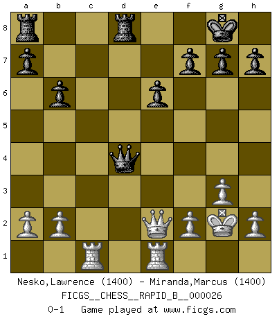 Last move : 0-1 2007 February 17 16:51:3 [Event "FICGS__CHESS__RAPID_B__000026"] [Site "FICGS"] [Date "2006.12.06"] [Round "1"] [White "Nesko,Lawrence"] [Black "Miranda,Marcus"] [Result "0-1"] [WhiteElo "1400"] [BlackElo "1400"] 1.d4 d5 2.Nf3 Nf6 3.g3 e6 4.Bg2 Be7 5.O-O O-O 6.c3 c5 7.Bf4 Nc6 8.Nbd2 b6 9.Re1 Bb7 10.e4 dxe4 11.Nxe4 Nd5 12.Bg5 cxd4 13.Bxe7 Qxe7 14.cxd4 Nf6 15.Nxf6+ Qxf6 16.Rc1 Rfd8 17.Qe2 Nxd4 18.Nxd4 Bxg2 19.Kxg2 Qxd4 0-1 This chess game has been lost on time (started : 2006.12.06 15:23:3) Queen's pawn game Kingside Castling by player White (move 5) Kingside Castling by player Black (move 5) Player Black won this chess game. Follow this game move after move (download)Excellence at Chess is one mark of a scheming mind. (Sir Arthur Conan Doyle) Unter Putin wird alles Geld aus Russland wie von einem Staubsauger nach Moskau umgeleitet, das ist wie ein schwarzes Loch. (Garry Kasparov) El Ajedrez es una manera fabulosa para que los niños aprendan a autovalorarse y a autoestimarse. (Saudin Robovic) J'apprécie les joueurs d'est-indienne, c'est grâce à eux que je nourris ma famille depuis tant d'années. (Petrosian) I just play for fun. (Anna Kournikova)