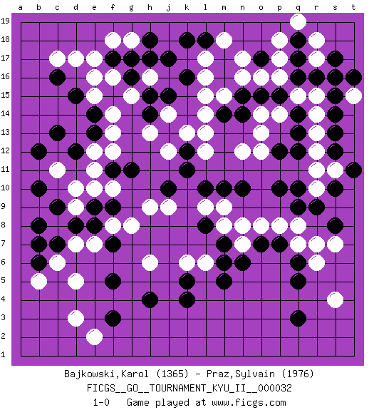Last move : 1-0 2011 February 13 22:27:4 [Event "FICGS__GO__TOURNAMENT_KYU_II__000032"] [Site "FICGS"] [Date "2011.01.24"] [Round "1"] [Black "Bajkowski,Karol"] [White "Praz,Sylvain"] [Result "1-0"] [Rating 1 "1365"] [Rating 2 "1976"] 1.q16 d17 2.q3 d3 3.k4 r6 4.q5 s4 5.q6 r7 6.f3 d5 7.f5 q7 8.p7 k6 9.k5 l6 10.m5 h6 11.h4 p8 12.o7 r14 13.q12 p14 14.o17 o12 15.p10 r10 16.q10 r11 17.p12 n12 18.q9 q8 19.r9 r12 20.n10 o8 21.m7 n7 22.n6 n8 23.l10 l12 24.m6 m8 25.l8 m9 26.m10 l9 27.k11 j9 28.k12 k13 29.j13 l13 30.j10 h9 31.f7 d7 32.c9 c11 33.b7 c6 34.b6 b5 35.e9 f8 36.c13 d10 37.e8 e7 38.f9 g8 39.f11 d9 40.d8 c8 41.c7 e12 42.e14 f12 43.g11 f14 44.f15 e15 45.d15 e16 46.d12 e11 47.e13 f13 48.c16 c17 49.b12 f10 50.b10 e10 51.b8 j14 52.s10 s11 53.q14 q15 54.q13 r15 55.h14 h13 56.p15 o14 57.s8 s7 58.r16 s16 59.s17 t15 60.s13 r13 61.s14 p16 62.o15 o16 63.n15 n16 64.n14 o13 65.m16 r17 66.q17 r18 67.s15 p17 68.q18 p18 69.t16 q19 70.s16 m15 71.m14 l15 72.t11 l14 73.s12 e2 74.m17 n17 75.j17 l17 76.f17 f16 77.g16 g15 78.l18 m18 79.j15 j12 80.k18 g18 81.g17 f18 82.h18 e17 83.k16 l16 84.h15 h16 85.h17 1-0 Here are the names of the openings (joseki) played in the four corners : Corner q4 : q3 r6 Komoku (Somok, Xiao~mu`) 3-4 Point. The komoku (3-4) point is the traditional corner enclosure move.. Niken Kakari (Dukan Keolch'im, E`r Gua`jiao~, 2-Space Low Approach). White 2 is used with friendly forces backing it up. Its purpose is to prevent a pincer. Locally it results in a loss, but may be appropriate fuseki strategy. It was popular in the late 1950s and early 1960s, but is not seen often nowadays, having been replaced by the one-space high approach, with which it has points in common. Corner d4 : d3 f3 Komoku (Somok, Xiao~mu`) 3-4 Point. The komoku (3-4) point is the traditional corner enclosure move.. Corner q16 : q16 r14 Hoshi (Hwajeom, Seongjeom, Xingwei`) 4-4 Point. The star or hoshi (4-4) point, emphasizing influence at the potential expense of territory. Ikken Kakari (Hankan Keolch'im, Yi Gua`jiao~, 1-Space Low Approach). White 2 is the standard approach move to the 4-4. Corner d16 : d17 j13 Komoku (Somok, Xiao~mu`) 3-4 Point. The komoku (3-4) point is the traditional corner enclosure move.. Player Black won this Go (weiqi, baduk) game. Follow this game move after move (download)Answer the keima with a kosumi. (Anonymous) Plans are ideas that never come to fruition. (Daniel Parmet)