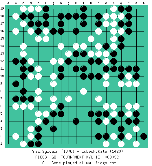 Last move : 1-0 2011 May 5 18:13:56 [Event "FICGS__GO__TOURNAMENT_KYU_II__000032"] [Site "FICGS"] [Date "2011.01.24"] [Round "1"] [Black "Praz,Sylvain"] [White "Lubeck,Kate"] [Result "1-0"] [Rating 1 "1976"] [Rating 2 "1420"] 1.r16 d16 2.q3 d3 3.f17 c14 4.l17 c6 5.k4 r6 6.r4 q9 7.r11 r10 8.q11 e10 9.d18 c17 10.h16 p17 11.q17 p16 12.q15 q18 13.r18 q16 14.r17 p15 15.q14 p14 16.p13 o13 17.p12 o12 18.o11 n11 19.n10 o10 20.p11 o9 21.m10 m11 22.l10 l8 23.l11 m13 24.l13 l14 25.k13 k14 26.n17 n16 27.m14 m15 28.o14 n14 29.n12 n13 30.m12 n7 31.o5 p6 32.g3 f5 33.c10 d12 34.c8 e7 35.c12 c13 36.d11 e11 37.b12 h14 38.g5 g6 39.h5 j7 40.e2 d2 41.e3 e4 42.f4 e5 43.s5 s6 44.q5 h12 45.h10 g9 46.m5 g10 47.h11 g12 48.b7 b6 49.d7 d6 50.c7 e8 51.b9 d10 52.c11 f15 53.c18 b18 54.d17 b16 55.e16 e15 56.d1 c1 57.e1 b2 58.k16 f16 59.e17 g17 60.g16 g18 61.f18 k19 62.h18 h19 63.h17 g19 64.l18 c19 65.f19 j19 66.l19 e19 67.k18 o17 68.n18 o18 69.q19 p18 70.s10 s9 71.q10 r9 72.s11 s3 73.s4 r2 74.q2 q1 75.p1 s1 76.t2 p2 77.r1 d19 78.j18 q1 79.o2 o1 80.n2 p5 81.p4 o4 82.n4 o6 83.n5 r5 84.h6 g7 85.j12 p19 86.r19 j13 87.k11 1-0 Here are the names of the openings (joseki) played in the four corners : Corner d16 : d16 f17 Hoshi (Hwajeom, Seongjeom, Xingwei`) 4-4 Point. The star or hoshi (4-4) point, emphasizing influence at the potential expense of territory. Ikken Kakari (Hankan Keolch'im, Yi Gua`jiao~, 1-Space Low Approach). Black 2 is the standard approach move to the 4-4. Corner q4 : q3 r6 Komoku (Somok, Xiao~mu`) 3-4 Point. The komoku (3-4) point is the traditional corner enclosure move.. Niken Kakari (Dukan Keolch'im, E`r Gua`jiao~, 2-Space Low Approach). White 2 is used with friendly forces backing it up. Its purpose is to prevent a pincer. Locally it results in a loss, but may be appropriate fuseki strategy. It was popular in the late 1950s and early 1960s, but is not seen often nowadays, having been replaced by the one-space high approach, with which it has points in common. Player Black won this Go (weiqi, baduk) game. Follow this game move after move (download)Don't be greedy ! (Anonymous) Computer Science is no more about computers than astronomy is about telescopes. (Edsger W. Dijkstra)