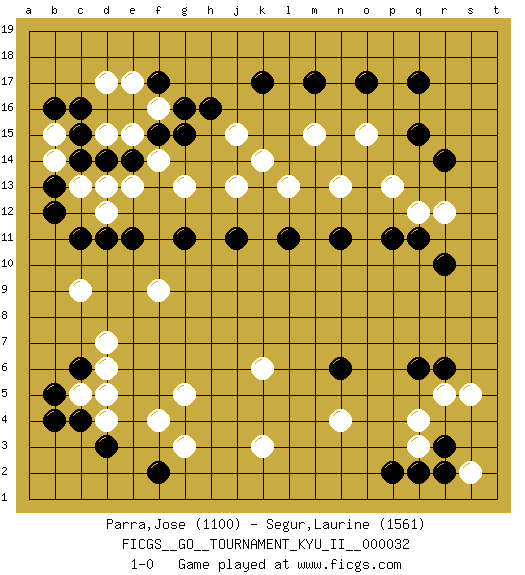 Last move : 1-0 2011 May 23 14:50:40 [Event "FICGS__GO__TOURNAMENT_KYU_II__000032"] [Site "FICGS"] [Date "2011.01.24"] [Round "1"] [Black "Parra,Jose"] [White "Segur,Laurine"] [Result "1-0"] [Rating 1 "1100"] [Rating 2 "1561"] 1.q17 q4 2.c16 d4 3.k17 k3 4.q15 c9 5.r6 r5 6.q6 c13 7.r10 n4 8.f17 g5 9.c6 d7 10.b4 c5 11.b5 d6 12.d3 f4 13.c4 d5 14.f2 g3 15.c11 b15 16.c15 b14 17.b16 e13 18.e11 g13 19.g11 f9 20.j11 j13 21.l11 l13 22.n11 n13 23.p11 p13 24.b12 d12 25.d11 q12 26.q11 r12 27.r14 j15 28.h16 e15 29.d14 d13 30.e14 f14 31.f15 f16 32.g15 d15 33.c14 e17 34.g16 d17 35.b13 m15 36.m17 o15 37.o17 k14 38.n6 k6 39.r3 s5 40.p2 q3 41.q2 s2 42.r2 1-0 Here are the names of the openings (joseki) played in the four corners : Corner q4 : q4 r6 Hoshi (Hwajeom, Seongjeom, Xingwei`) 4-4 Point. The star or hoshi (4-4) point, emphasizing influence at the potential expense of territory. Ikken Kakari (Hankan Keolch'im, Yi Gua`jiao~, 1-Space Low Approach). Black 2 is the standard approach move to the 4-4. Corner d16 : c16 c13 Komoku (Somok, Xiao~mu`) 3-4 Point. The komoku (3-4) point is the traditional corner enclosure move.. Player Black won this Go (weiqi, baduk) game. Follow this game move after move (download)In an unreasonable situation, an unreasonable move is reasonable. (Tamino) A clear conscience is usually the sign of a bad memory. (Unknown)