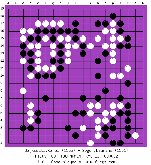 Last move : 1-0 2011 July 3 2:21:7 [Event "FICGS__GO__TOURNAMENT_KYU_II__000032"] [Site "FICGS"] [Date "2011.01.24"] [Round "1"] [Black "Bajkowski,Karol"] [White "Segur,Laurine"] [Result "1-0"] [Rating 1 "1365"] [Rating 2 "1561"] 1.q16 q4 2.c3 d16 3.o3 l3 4.r6 o5 5.r3 q3 6.r4 n4 7.q5 p2 8.p4 p5 9.p3 q2 10.o2 s2 11.r2 q6 12.r5 c12 13.k17 c8 14.j3 d5 15.e4 d4 16.d3 h17 17.k15 n15 18.n17 o16 19.o17 p16 20.q17 p17 21.p18 q15 22.r15 p14 23.q14 p15 24.r14 p12 25.q7 p6 26.o8 p10 27.k5 m6 28.l7 n3 29.k2 n2 30.p1 m1 31.l5 o4 32.q1 m5 33.n7 n6 34.e5 d6 35.f7 d10 36.n12 m14 37.o13 p13 38.l13 r11 39.r9 q10 40.n10 o14 41.f10 g13 42.g15 h15 43.h14 g14 44.h16 j15 45.j16 j14 46.h13 j13 47.h12 j12 48.g12 f17 49.f16 f15 50.g16 k14 51.l14 l15 52.k16 g17 53.c14 e14 54.e16 e17 55.d15 c16 56.d13 d14 57.c13 c15 58.e15 e13 59.d12 e12 60.d11 e11 61.e10 f11 62.g10 g11 63.h11 1-0 Here are the names of the openings (joseki) played in the four corners : Corner q4 : q4 o3 Hoshi (Hwajeom, Seongjeom, Xingwei`) 4-4 Point. The star or hoshi (4-4) point, emphasizing influence at the potential expense of territory. Ikken Kakari (Hankan Keolch'im, Yi Gua`jiao~, 1-Space Low Approach). Black 2 is the standard approach move to the 4-4. Corner d4 : c3 c8 San-San (Sam-Sam, San-San) 3-3 Point. The San-San (3-3) point, emphasizing territory at the expense of influence. Corner q16 : q16 n15 Hoshi (Hwajeom, Seongjeom, Xingwei`) 4-4 Point. The star or hoshi (4-4) point, emphasizing influence at the potential expense of territory. Player Black won this Go (weiqi, baduk) game. Follow this game move after move (download)The possibility or impossibility of an event results logically from the rules. (Pierre Audouard) Before all elsed, be armed. (Niccolo Machiavelli)