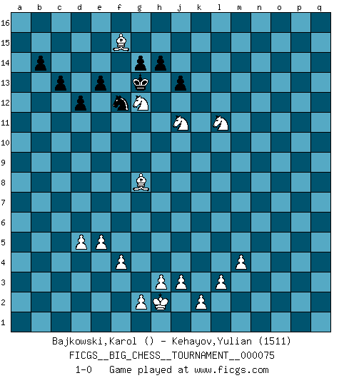 Last move : 1-0 2011 February 10 10:4:8 [Event "FICGS__BIG_CHESS__TOURNAMENT__000075"] [Site "FICGS"] [Date "2011.01.24"] [Round "1"] [White "Bajkowski,Karol"] [Black "Kehayov,Yulian"] [Result "1-0"] [WhiteElo ""] [BlackElo "1511"] 1.b1-c3 j15-k13 2.j2-k4 h16-o10 3.h2-g4 o10-o2 4.m2-m4 o2-o10 5.k1-l3 e15-e13 6.d2-d4 f16-c13 7.p1-o3 c13-b12 8.n2-n4 m15-m13 9.e2-e4 n15-n13 10.f1-c4 p16-o14 11.h1-n6 o10-m12 12.d4-d5 d15-d13 13.n6-b6 o16-f8 14.c1-h6 f8-h6 15.g4-h6 b12-h6 16.b6-h6 l16-o13 17.l1-q6 c16-k9 18.g1-f3 b16-c14 19.o1-f9 m12-l13 20.o3-n5 e16-e14 21.e1-e3 g16-j15 22.f3-g5 e14-f14 23.c4-b5 h15-j13 24.q6-p5 f14-f12 25.m1-o1 k16-h15 26.o1-o6 j15-h13 27.q1-o1 o13-n12 28.a1-f1 j16-j15 29.o6-l6 l13-k12 30.o1-o9 n12-p10 31.p5-q6 k12-q12 32.o9-k9 p10-l6 33.h6-l6 k13-j11 34.k9-k5 q12-l12 35.l6-p10 q16-p16 36.k5-l5 l12-n12 37.p10-p9 n12-m12 38.p9-m12 n13-m12 39.e3-f3 l15-l14 40.j1-j2 k15-k14 41.f1-o1 l14-l13 42.f9-c6 m16-m14 43.f3-f12 h13-f12 44.c3-e2 m14-n14 45.e2-g3 p16-m16 46.g3-h5 n14-n11 47.l3-k5 m16-m14 48.f2-f4 m14-n14 49.k4-j6 n14-n13 50.k5-l7 n13-q13 51.o1-o6 a16-n16 52.q6-m10 n11-n10 53.c6-n16 q13-q2 54.m10-j13 h15-j13 55.n16-f9 q2-p2 56.g5-h7 p2-p1 57.h5-j7 p1-d1 58.o6-p6 p15-p14 59.p6-o6 n10-n14 60.o6-o4 d1-d2 61.j2-h2 d2-c2 62.l7-k9 j11-k9 63.j7-k9 c2-b2 64.n5-m7 b2-a2 65.j6-h8 a2-a7 66.m7-l9 n14-n11 67.h7-g9 a7-e7 68.e4-e5 e7-g7 69.g9-j8 g7-c7 70.o4-o14 n11-n15 71.l5-o5 c7-n7 72.o14-o15 n15-o15 73.o5-o15 j13-k15 74.f9-l14 n7-n4 75.o15-k15 j15-h16 76.l2-l3 k14-k13 77.l14-m13 l13-l12 78.k15-q15 m12-m11 79.b5-a6 j14-j13 80.q15-q16 h16-h15 81.a6-b5 h15-g14 82.b5-k13 c14-e15 83.m13-l12 b15-b14 84.l12-k11 g14-f14 85.k13-m11 p14-p13 86.j8-h10 p13-p12 87.q16-p16 n4-p4 88.l9-n10 a15-a14 89.k11-n14 p12-p11 90.p16-p11 p4-p11 91.n10-p11 a14-a13 92.k9-j11 e15-g14 93.h8-g10 f12-g10 94.j11-g10 d13-d12 95.n14-g8 c15-c13 96.h10-g12 f14-g13 97.g10-j11 a13-a12 98.m11-f5 a12-a11 99.p11-n10 a11-a10 100.f5-a10 g14-f12 101.a10-f15 g15-g14 102.n10-l11 1-0 Follow this game move after move (download)Blessed be the memory of him who gave the world this immortal game. (A. G. Gardiner) Ich hatte meine größten Erfolge, als ich 47 Jahre alt war. Kasparow war noch nicht mal 42 und hat das Schach schon im Stich gelassen. (Viktor Kortschnoi) A través de las casillas del tablero, los Indios explican el movimiento del tiempo y la edad, las influencias mas altas que controlan el mundo y los lazos que vinculan al Ajedrez con el alma humana. (Al-Masudi) Mon pion favori sur ma case favorite ! Bronstein en parlant d'un coup de pion en h5 quand il avait les Noirs. To send light into the darkness of men's hearts - such is the duty of the artist. (Schumann)