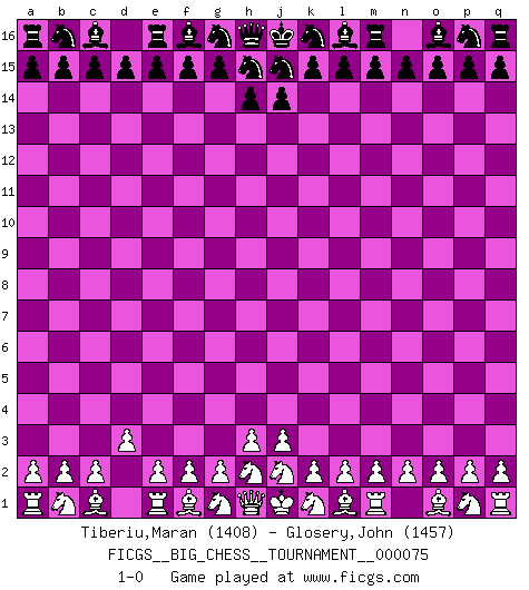 Last move : 1-0 2011 February 8 19:47:45 [Event "FICGS__BIG_CHESS__TOURNAMENT__000075"] [Site "FICGS"] [Date "2011.01.24"] [Round "1"] [White "Tiberiu,Maran"] [Black "Glosery,John"] [Result "1-0"] [WhiteElo "1408"] [BlackElo "1457"] 1.d2-d3 1-0 Follow this game move after move (download)Chess problems demand from the composer the same virtues that characterize all worthwhile art: originality, invention, conciseness, harmony, complexity, and splendid insincerity. (Vladimir Nabokov) Zum Sieg gelangt man nicht, wenn man gut, sondern nur wenn man besser spielt (Savielly Grigorievitsch Tartakower) Las Aperturas te enseñan aperturas. ¡Los Finales te enseñan Ajedrez!. (Stephan Gerzadowicz) Le thème de l'attaque double intervient d'une manière ou d'une autre dans l'immense majorité des combinaisons. (Youri Averbakh) The beginning of wisdom is silence. The second step is listening. (Unknown)