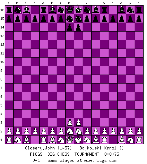 Last move : 0-1 2011 January 27 2:42:59 [Event "FICGS__BIG_CHESS__TOURNAMENT__000075"] [Site "FICGS"] [Date "2011.01.24"] [Round "1"] [White "Glosery,John"] [Black "Bajkowski,Karol"] [Result "0-1"] [WhiteElo "1457"] [BlackElo ""] 0-1 Follow this game move after move (download)Checkers is for tramps. (Paul Morphy) Wie, soll nun auch die Opposition abgeschafft werden? Ja, es tut mir leid, Ihnen diesen Schmerz nicht ersparen zu können. (Aaron Nimzowitsch) Solo el jugador con la iniciativa tiene el derecho a atacar. (Wilhelm Steinitz) L'ordinateur a tué l'originalité. Il n'y a plus guère d'aventures sur l'échiquier. (Jacob Murray) If you know the enemy and know yourself you need not fear the results of a hundred battles. (Sun Tzu)