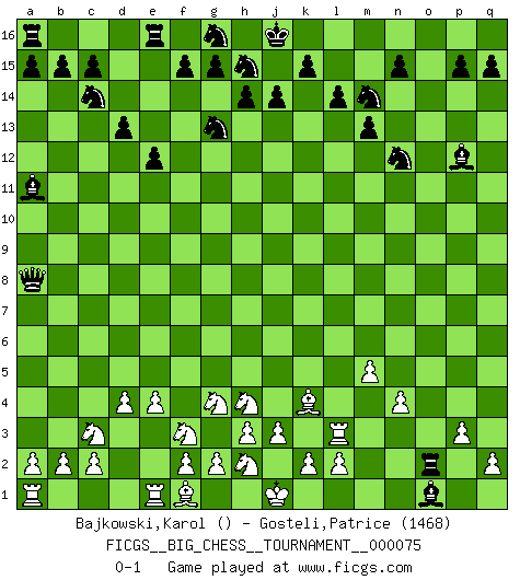 Last move : 0-1 2011 January 29 16:10:26 [Event "FICGS__BIG_CHESS__TOURNAMENT__000075"] [Site "FICGS"] [Date "2011.01.24"] [Round "1"] [White "Bajkowski,Karol"] [Black "Gosteli,Patrice"] [Result "0-1"] [WhiteElo ""] [BlackElo "1468"] 1.d2-d4 j15-k13 2.h2-g4 e15-e13 3.j2-h4 m15-m13 4.h1-o7 h15-g13 5.o7-o15 p16-o14 6.c1-p13 k13-m14 7.o15-o16 q16-o16 8.p1-o3 f16-a11 9.g1-f3 h16-p9 10.p13-h6 d15-d13 11.n2-n4 o14-n12 12.m2-m4 c16-l8 13.o1-d11 e13-e12 14.d11-a8 l16-p12 15.k1-h2 k16-h15 16.p2-p3 o16-o3 17.l1-n3 m16-o16 18.q1-o1 l8-p4 19.m1-m3 o3-o8 20.m4-m5 p4-n2 21.n3-l5 n2-o1 22.l5-o8 p9-o8 23.h6-k4 o8-a8 24.m3-l3 l15-l14 25.b1-c3 b16-c14 26.e2-e4 o16-o2 0-1 Follow this game move after move (download)One of these modest little moves may be more embarrassing to your opponent than the biggest threat. (Siegbert Tarrasch) Der 70jährige Viktor Kortschnoi: Die Rentenanstalt wollte mich zwingen in Rente zu gehen. Meine Frau erhält jetzt eine Pension- und ich zahle weiter in die Rentenkasse ein! (Viktor Kortschnoi) En el Ajedrez, tal como es jugado por los Maestros, practicamente la suerte es eliminada. (Emanuel Lasker) Pour moi, les échecs ne sont pas un jeu mais un art. (Alexandre Alekhine) He who fights with monsters should be careful lest he thereby become a monster. (Friedrich Nietzsche, Beyond Good and Evil)