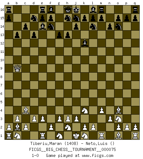 Last move : 1-0 2011 March 22 0:34:44 [Event "FICGS__BIG_CHESS__TOURNAMENT__000075"] [Site "FICGS"] [Date "2011.01.24"] [Round "1"] [White "Tiberiu,Maran"] [Black "Neto,Luis"] [Result "1-0"] [WhiteElo "1408"] [BlackElo ""] 1.e2-e3 g15-g13 2.f1-c4 n15-n14 3.g2-g3 d15-d13 4.j2-k4 p16-o14 5.h1-l4 k16-l14 6.m2-m4 c16-k9 7.l4-f9 k9-e14 8.l1-o4 c15-c14 9.n2-n3 g16-f14 10.f9-b9 b15-b13 11.b2-b3 b16-d15 12.p1-o3 o16-k12 13.c1-b2 h14-h13 14.d2-d3 1-0 This big chess game has been lost on time (started : 2011.01.24 23:47:27) Follow this game move after move (download)Chess, like love, is infectious at any age. (Flohr) Mein erstes Ziel war nicht, die Partie zu gewinnen, sondern eine Figur zu opfern. -- der junge (Wilhelm Steinitz) Yo considero que Fischer es uno de los expertos mas grandes de aperturas de siempre. (Keith Hayward) Le jeu d'échecs fait naître et fortifie en nous plusieurs qualités précieuses dans le cours de l'existence, telles que la prévoyance, la circonspection, la prudence, et la persévérance. (Benjamin Franklin - 1783, la morale des échecs) I can't decide which is riskier; taking crazy risks, or taking advice on crazy risks from a crazy risk taker. (Gregory House in House M.D.)
