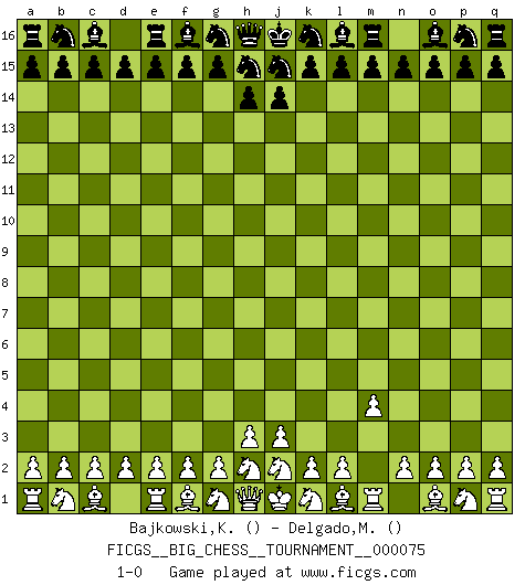 Last move : 1-0 2011 February 24 11:5:26 [Event "FICGS__BIG_CHESS__TOURNAMENT__000075"] [Site "FICGS"] [Date "2011.01.24"] [Round "1"] [White "Bajkowski,Karol"] [Black "Delgado,Mauricio"] [Result "1-0"] [WhiteElo ""] [BlackElo ""] 1.m2-m4 1-0 This big chess game has been lost on time (started : 2011.01.24 23:47:27) Follow this game move after move (download)All my games are real. (Bobby Fischer) Korrekt heißt in Deutschland die Haltung eines Mannes, dessen Benehmen nach dem Urteile seiner Nachbarn seiner Stellung angemessen ist. Um korrekt zu sein, muß man sich der Meinung der anderen anpassen... (Emanuel Lasker) A través de las casillas del tablero, los Indios explican el movimiento del tiempo y la edad, las influencias mas altas que controlan el mundo y los lazos que vinculan al Ajedrez con el alma humana. (Al-Masudi) J'ai vu le vaincu d'Echecs jouer des années durant dans l'espoir de la fête de la victoire. Car tu es plus riche de ce qu'elle existe si même elle n'est point pour toi. Ainsi de la perle du fond des mers. (Antoine de Saint-Exupéry) Macintosh - we might not get everything right, but at least we knew the century was going to end. (Douglas Adams)
