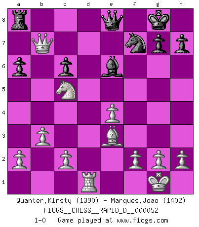 Last move : 1-0 2011 March 1 20:6:3 [Event "FICGS__CHESS__RAPID_D__000052"] [Site "FICGS"] [Date "2011.01.25"] [Round "1"] [White "Quanter,Kirsty"] [Black "Marques,Joao"] [Result "1-0"] [WhiteElo "1390"] [BlackElo "1402"] 1.e4 e5 2.Nf3 Nc6 3.Bb5 a6 4.Bxc6 dxc6 5.O-O Bd6 6.d4 exd4 7.Qxd4 f6 8.Nc3 Be6 9.Be3 Ne7 10.Na4 O-O 11.Rad1 Qe8 12.Nc5 Be5 13.Nxe5 fxe5 14.Qxe5 Bc4 15.Rd7 Rf7 16.Rfd1 Ng6 17.Qxc7 Ne5 18.Rxf7 Nxf7 19.b3 Be6 20.Qxb7 1-0 Ruy Lopez : Exchange variation, 5.O-O Kingside Castling by player White (move 5) Kingside Castling by player Black (move 10) Player White won this chess game. Follow this game move after move (download)I prefer to lose a really good game than to win a bad one. (David Levy) Alle Schachspieler sollten auch ein Hobby haben. (Savielly Grigorievitsch Tartakower) El Ajedrez no es una pizca de inferior al violín, y tenemos un gran número de violinistas profesionales. (Mikhail Botvinnik) Nous vivons dans un monde échiquéen : chaque jour qui passe est un défi à relever. (Philosophe Sasha) I teach you to lie, cheat and steal, and as soon as my back's turned you wait in line ? (Gregory House, House M.D.)