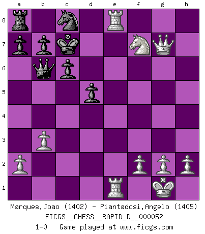 Last move : 1-0 2011 March 24 1:17:15 [Event "FICGS__CHESS__RAPID_D__000052"] [Site "FICGS"] [Date "2011.01.25"] [Round "1"] [White "Marques,Joao"] [Black "Piantadosi,Angelo"] [Result "1-0"] [WhiteElo "1402"] [BlackElo "1405"] 1.e4 Nf6 2.e5 Nd5 3.c4 Nb6 4.d4 d6 5.exd6 exd6 6.b3 Bf5 7.Bd3 Bxd3 8.Qxd3 Be7 9.Nf3 O-O 10.O-O Bf6 11.Nc3 N8d7 12.Ne4 Re8 13.Bg5 c6 14.Bxf6 Nxf6 15.Nfg5 d5 16.Nxf6+ Qxf6 17.Qxh7+ Kf8 18.Qh8+ Ke7 19.Rfe1+ Kd7 20.Qh3+ Kc7 21.Qg3+ Kd7 22.c5 Nc8 23.Rxe8 Qxd4 24.Rae1 Qxc5 25.Nxf7 Qb6 26.Qg4+ Kc7 27.Qxg7 1-0 Alekhine's defense Kingside Castling by player Black (move 9) Kingside Castling by player White (move 10) Player White won this chess game. Follow this game move after move (download)At this time Fischer is simply a level above all the best Chessplayers in the world. (John Jacobs) Im Schach gibt es keinen Platz für Galanterie. (Irving Chernev) El poder defensivo de una pieza clavada, solamente es imaginario. (Aaron Nimzovich) Le système Elo représente seulement une moyenne. Il est simplement un indicateur de votre stabilité. (Anatoli Karpov) Nothing is more important for teaching us to understand the concepts we have than constructing fictitious ones. (Ludwig Wittgenstein)