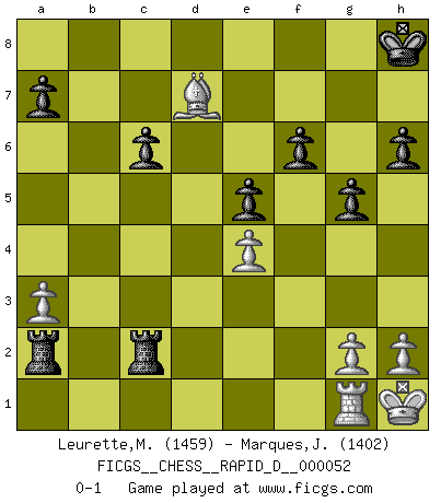 Last move : 0-1 2011 March 24 20:45:26 [Event "FICGS__CHESS__RAPID_D__000052"] [Site "FICGS"] [Date "2011.01.25"] [Round "1"] [White "Leurette,Marc-Antoine"] [Black "Marques,Joao"] [Result "0-1"] [WhiteElo "1459"] [BlackElo "1402"] 1.e4 e5 2.Nf3 Nc6 3.Bc4 Nf6 4.Ng5 d5 5.exd5 Nxd5 6.d4 Nxd4 7.c3 h6 8.Nf3 Nxf3+ 9.Qxf3 Be6 10.O-O Bc5 11.b4 Be7 12.Bb2 O-O 13.Nd2 c6 14.Rae1 f6 15.Ne4 Qc8 16.Bb3 Kh8 17.a3 Bg4 18.Qg3 Nf4 19.f3 Bf5 20.Bc1 Nd3 21.Rd1 Nxc1 22.Rxc1 Qc7 23.c4 Bxe4 24.fxe4 Rad8 25.c5 Rd4 26.Rfe1 Rfd8 27.Rc3 b6 28.Be6 bxc5 29.Bf5 g5 30.Qh3 Bf8 31.bxc5 Rd1 32.Rf1 Qa5 33.Qf3 Bxc5+ 34.Re3 Bxe3+ 35.Qxe3 R1d3 36.Qc1 Qb6+ 37.Kh1 Rd2 38.Bh3 Qb2 39.Qxb2 Rxb2 40.Bg4 R8d2 41.Rg1 Ra2 42.Bd7 Rdc2 0-1 Two knights defense : Lolli attack Kingside Castling by player White (move 10) Kingside Castling by player Black (move 12) Player Black won this chess game. Follow this game move after move (download)Chess is thirty to forty percent psychology. You don't have this when you play a computer. I can't confuse it. (Judith Polgar) Ich verstehe Aljechins Kombinationen ganz gut; aber woher er diese Angriffschancen bekommt und wie er die Eröffnung behandelt das ist für mich ein Buch mit sieben Siegeln. (Rudolf Spielmann) No solamente yo pronostico su triunfo sobre Botvinnik, sino que me adelanto y digo que probablemente Fischer es el jugador de Ajedrez mas grande que haya existido. (John Collins) Toute estimation doit être constamment réévaluée. (Jacob Estrin) If we don't succeed, we run the risk of failure. (George W. Bush)