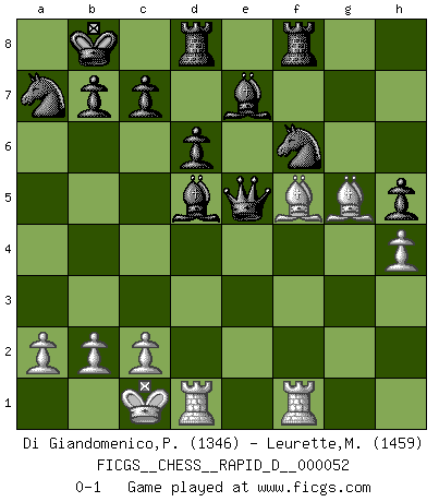 Last move : 0-1 2011 March 5 21:30:1 [Event "FICGS__CHESS__RAPID_D__000052"] [Site "FICGS"] [Date "2011.01.25"] [Round "1"] [White "Di Giandomenico,Pierino"] [Black "Leurette,Marc-Antoine"] [Result "0-1"] [WhiteElo "1346"] [BlackElo "1459"] 1.Nc3 e5 2.d4 exd4 3.Qxd4 Nc6 4.Qe4+ Be7 5.Bg5 f6 6.Bf4 g5 7.Be3 d6 8.Nd5 f5 9.Qa4 h6 10.Nf3 Be6 11.O-O-O Bxd5 12.Qa3 Nf6 13.h4 g4 14.Nd4 h5 15.f3 gxf3 16.exf3 Qd7 17.Bb5 O-O-O 18.Qxa7 Nxa7 19.Nxf5 Qxf5 20.Bd3 Qe5 21.Rhe1 Qg3 22.Bg5 Qxg2 23.Rg1 Qxf3 24.Rgf1 Qg3 25.Bf5+ Kb8 26.Rg1 Qe5 27.Rgf1 Rhf8 0-1 Dunst (Sleipner-Heinrichsen) Opening Queenside Castling by player White (move 11) Queenside Castling by player Black (move 17) Player Black won this chess game. Follow this game move after move (download)Only sissies Castle. (Rob Sillars) Die Neutralität betrachte ich als eine schwere Krankheit. (Viktor Kortschnoi) La única cosa que los jugadores de Ajedrez tienen en común, es el Ajedrez. (Lodewijk Prins) Mais l'homme est une créature légère et illogique : semblable au joueur d'échecs, il n'aime que le processus du but à atteindre, non le but lui-même. (Dostoïevsky) A generalist learns less and less about more and more until he knows nothing about everything. (Author unknown)