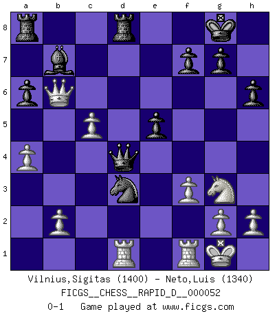 Last move : 0-1 2011 April 22 4:6:36 [Event "FICGS__CHESS__RAPID_D__000052"] [Site "FICGS"] [Date "2011.01.25"] [Round "1"] [White "Vilnius,Sigitas"] [Black "Neto,Luis"] [Result "0-1"] [WhiteElo "1400"] [BlackElo "1340"] 1.e4 e5 2.Nf3 Nc6 3.Bb5 a6 4.Ba4 Bd6 5.O-O b5 6.Bb3 Bb7 7.d3 Nf6 8.Bg5 h6 9.Bh4 O-O 10.Nbd2 Be7 11.a4 d6 12.c4 Nb4 13.d4 Nxe4 14.Nxe4 Bxh4 15.Nxh4 Qxh4 16.Ng3 bxc4 17.Bxc4 c5 18.dxc5 Qxc4 19.Qxd6 Nd3 20.Rad1 Rfd8 21.Qb6 Qd5 22.f3 Qd4+ 0-1 This chess game has been lost on time (started : 2011.01.25 17:23:49) Ruy Lopez Kingside Castling by player White (move 5) Kingside Castling by player Black (move 9) Player Black won this chess game. Follow this game move after move (download)Chess holds its master in its own bonds, shackling the mind and brain so that the inner freedom of the very strongest must suffer. (Albert Einstein) Rubinstein ist ein Turmendspiel, welches die Götter vor tausenden von Jahren begannen. (Savielly Grigorievitsch Tartakower) No hay un Gran Maestro de Ajedrez que sea normal; solo se diferencían ellos por la magnitud de su locura. (Viktor Korchnoi) Vous n'êtes pas toujours obligé de jouer le meilleur coup. Un coup doit être actif, entreprenant, correct et beau ! (David Bronstein) Plans are ideas that never come to fruition. (Daniel Parmet)