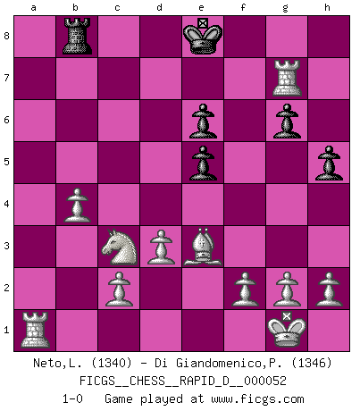 Last move : 1-0 2011 May 6 20:14:17 [Event "FICGS__CHESS__RAPID_D__000052"] [Site "FICGS"] [Date "2011.01.25"] [Round "1"] [White "Neto,Luis"] [Black "Di Giandomenico,Pierino"] [Result "1-0"] [WhiteElo "1340"] [BlackElo "1346"] 1.e4 Nf6 2.e5 Nh5 3.Qxh5 g6 4.Qh4 d6 5.exd6 cxd6 6.Bc4 Be6 7.Qd4 Qc8 8.Bb5+ Bd7 9.Bxd7+ Qxd7 10.Qxh8 Qe6+ 11.Ne2 h5 12.Nbc3 Nd7 13.d3 Rc8 14.O-O a6 15.Re1 Qe5 16.Qxe5 dxe5 17.Be3 Bg7 18.a4 b5 19.axb5 Ra8 20.bxa6 Nb8 21.Nd5 Nxa6 22.Rxa6 Rb8 23.b4 Rd8 24.Nec3 e6 25.Nc7+ Kd7 26.Nxe6 fxe6 27.Ra7+ Ke8 28.Rxg7 Rb8 29.Ra1 1-0 Alekhine's defense Kingside Castling by player White (move 14) Player White won this chess game. Follow this game move after move (download)I have added these principles to the law: get the Knights into action before both Bishops are developed. (Emanuel Lasker) Wenn ich Weiß habe gewinne ich weil ich Weiß habe, wenn ich Schwarz habe gewinne ich weil ich Bogoljubov bin. (Efim Bogoljubov) Fischer es el jugador mas fuerte del mundo. De hecho, el jugador mas fuerte que jamas haya existido. (Larry Evans) Echiquier : carré parfait, comme la Jérusalem nouvelle décrite par l'auteur de l'Apocalypse, huit cases sur huit, exaltation du chiffre 4, symbole du cosmos aux quatre horizons... où le noir et le blanc, l'ombre et la lumière, le mal et le bien s'entremêlent et se conjuguent. (Robert Couffignal, Le Gambit du poète) Pushing plastic is for the many, pushing virtual pieces is for the fewer, pushing wood is for the very few. (Normajean Yates)