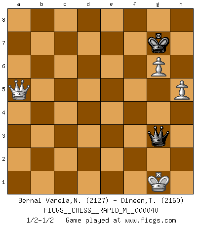 Last move : 1/2-1/2 2011 May 25 3:38:31 [Event "FICGS__CHESS__RAPID_M__000040"] [Site "FICGS"] [Date "2011.01.26"] [Round "1"] [White "Bernal Varela,Nelson"] [Black "Dineen,Thomas"] [Result "1/2-1/2"] [WhiteElo "2127"] [BlackElo "2160"] 1.e4 e6 2.d4 d5 3.Nd2 Nf6 4.Bd3 c5 5.e5 Nfd7 6.c3 Nc6 7.Ne2 cxd4 8.cxd4 Qb6 9.Nf3 f6 10.exf6 Nxf6 11.O-O Bd6 12.Re1 O-O 13.Bf4 Bxf4 14.Nxf4 Qxb2 15.Nxe6 Bxe6 16.Rxe6 Rae8 17.Rb1 Qxa2 18.Rxe8 Rxe8 19.Rxb7 Ne4 20.Qf1 h6 21.h3 Qa5 22.Qc1 Nxd4 23.Nxd4 Nc5 24.Rxg7+ Kxg7 25.Nf5+ Kf7 26.Nd6+ Kg8 27.Qxh6 Re1+ 28.Kh2 Qc7 29.Qg5+ Kf8 30.Qf6+ Kg8 31.Bg6 Ne4 32.Qe6+ Kg7 33.Bxe4 Rxe4 34.Qxd5 Re1 35.h4 a5 36.h5 Kh7 37.g4 Qd7 38.g5 Qe6 39.Qd3+ Kg8 40.Nf5 Re4 41.Qd8+ Qe8 42.Qd5+ Kh8 43.Ng3 Rf4 44.Kg2 Qf7 45.Qa8+ Kg7 46.Kg1 Rg4 47.g6 Rxg3+ 48.fxg3 Qb3 49.Qxa5 Qxg3+ 1/2-1/2 French : Tarrasch, Closed variation Kingside Castling by player White (move 11) Kingside Castling by player Black (move 12) 10 pieces endgame at move 34 : White KQNPPP , Black KQRP WHITE : King + 1 Queen 1 Knight 3 Pawns BLACK : King + 1 Queen 1 Rook 1 Pawn 9 pieces endgame at move 47 : White KQPPP , Black KQRP WHITE : King + 1 Queen 3 Pawns BLACK : King + 1 Queen 1 Rook 1 Pawn 8 pieces endgame at move 48 : White KQPPP , Black KQP WHITE : King + 1 Queen 3 Pawns BLACK : King + 1 Queen 1 Pawn 7 pieces endgame at move 49 : White KQPPP , Black KQ WHITE : King + 1 Queen 3 Pawns BLACK : King + 1 Queen 6 pieces endgame at move 49 : White KQPP , Black KQ WHITE : King + 1 Queen 2 Pawns BLACK : King + 1 Queen This chess game ended in a draw. Follow this game move after move (download)We must make sure that Chess will not be like a dead language, very interesting, but for a very small group. (Sytze Faber) Kein Großmeister ist normal. Sie unterscheiden sich nur im Ausmaß Ihrer Verrücktheit. (Viktor Kortschnoi) La táctica fluye a partir de una posición superior. (Bobby Fischer) Les écrivains ont utilisé les échecs pour analyser les côtés extrêmes de la nature humaine. Dans ce cadre, les échecs offrent un champ d'expérimentation idéal. Mais on pourrait faire la même chose avec la peinture. Et là, en vous référant à Van Gogh, vous ne tirerez pas de conclusion définitive sur les peintres. (Gary Kasparov) Your best chance to get a Royal Flush in a casino is in the bathroom. (Anonymous)