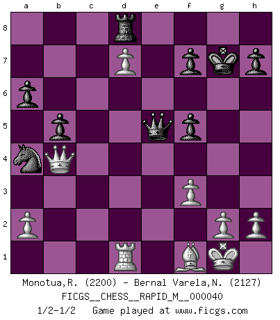 Last move : 1/2-1/2 2011 May 28 23:11:28 [Event "FICGS__CHESS__RAPID_M__000040"] [Site "FICGS"] [Date "2011.01.26"] [Round "1"] [White "Monotua,Rotom"] [Black "Bernal Varela,Nelson"] [Result "1/2-1/2"] [WhiteElo "2200"] [BlackElo "2127"] 1.d4 Nf6 2.c4 g6 3.Nc3 d5 4.cxd5 Nxd5 5.e4 Nxc3 6.bxc3 Bg7 7.Bc4 c5 8.Ne2 Nc6 9.Be3 cxd4 10.cxd4 O-O 11.O-O Na5 12.Bd3 Nc6 13.Bb5 Bd7 14.Rc1 a6 15.Bc4 Rc8 16.Qd2 e6 17.d5 Ne5 18.Bb3 exd5 19.Bg5 Bf6 20.Rxc8 Bxc8 21.Bxf6 Qxf6 22.exd5 Nd7 23.Rc1 b6 24.f3 Nc5 25.Ng3 Bf5 26.Bc4 Kg7 27.Bf1 Rd8 28.Rd1 b5 29.Nxf5+ gxf5 30.Qb4 Na4 31.d6 Qe5 32.d7 1/2-1/2 King's Indian defense, 3.Nc3 Kingside Castling by player Black (move 10) Kingside Castling by player White (move 11) This chess game ended in a draw. Follow this game move after move (download)Nothing excites jaded Grandmasters more than a theoretical novelty. (Dominic Lawson) Du musst Deinen Gegner in einen tiefen dunklen Wald führen wo 2+2=5 ist und wo der Weg, der wieder hinausführt, nur breit genug für einen ist. (Mikhail Nekhemyevich Tal) El Ajedrez es como la guerra en un tablero. (Bobby Fischer) La vie et les Echecs sont tous les deux une lutte constante. (Lasker) The Internet is the world's largest library. It's just that all the books are on the floor. (John Allen Paulos)