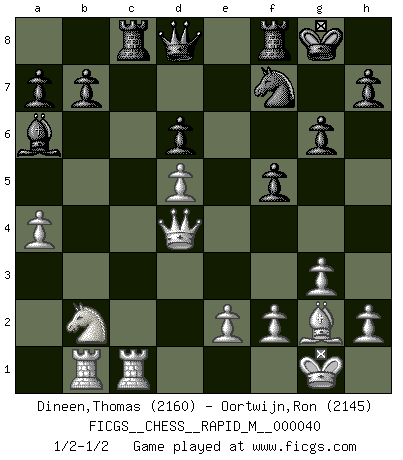 Last move : 1/2-1/2 2011 March 16 20:0:16 [Event "FICGS__CHESS__RAPID_M__000040"] [Site "FICGS"] [Date "2011.01.26"] [Round "1"] [White "Dineen,Thomas"] [Black "Oortwijn,Ron"] [Result "1/2-1/2"] [WhiteElo "2160"] [BlackElo "2145"] 1.d4 f5 2.g3 d6 3.Nf3 g6 4.Bg2 Bg7 5.O-O Nf6 6.c4 c6 7.Nc3 O-O 8.d5 Bd7 9.Rb1 Na6 10.b4 Nc7 11.dxc6 Bxc6 12.b5 Ne4 13.Na4 Be8 14.Nd2 d5 15.cxd5 Nd6 16.Bb2 Bxb2 17.Nxb2 Bxb5 18.a4 Ba6 19.Re1 Nf7 20.Ndc4 Rc8 21.Qd4 Ne8 22.Rec1 Ned6 23.Nxd6 exd6 1/2-1/2 Dutch defense Kingside Castling by player White (move 5) Kingside Castling by player Black (move 7) This chess game ended in a draw. Follow this game move after move (download)We cannot resist the fascination of sacrifice, since a passion for sacrifices is part of a Chessplayer's nature. (Rudolf Spielman) Schach ist das Spiel, das die Verrückten gesund hält. (Albert Einstein) Los finales de Peón son del Ajedrez lo que el cesped es del Golf. (Cecil Purdy) Toute estimation doit être constamment réévaluée. (Jacob Estrin) Warrior pose battles inner weakness and wins focus. You see that there is no war within you. You're on your own side, and you are your own strength. (Terri Guillemets)