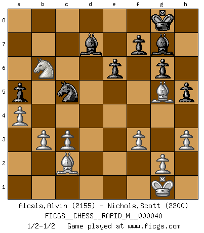 Last move : 1/2-1/2 2011 February 17 0:42:31 [Event "FICGS__CHESS__RAPID_M__000040"] [Site "FICGS"] [Date "2011.01.26"] [Round "1"] [White "Alcala,Alvin"] [Black "Nichols,Scott"] [Result "1/2-1/2"] [WhiteElo "2155"] [BlackElo "2200"] 1.e4 h5 2.d4 c5 3.Nf3 cxd4 4.Nxd4 Nf6 5.Nc3 Nc6 6.Nb3 g6 7.Be2 Bg7 8.h3 O-O 9.O-O b6 10.Bg5 Bb7 11.Qd2 a5 12.a4 Rc8 13.Rad1 Nb4 14.Nd4 Nxe4 15.Nxe4 Bxe4 16.c3 Nc6 17.Nb5 d5 18.Rfe1 Re8 19.f3 Bf5 20.Qxd5 Qxd5 21.Rxd5 Be6 22.Rd2 Red8 23.Rxd8+ Rxd8 24.Rd1 Rxd1+ 25.Bxd1 Ne5 26.Nc7 Bd7 27.b3 Nd3 28.Bc2 Nc5 29.Nd5 e6 30.Nxb6 1/2-1/2 King's pawn Opening Kingside Castling by player Black (move 8) Kingside Castling by player White (move 9) This chess game ended in a draw. Follow this game move after move (download)Daring ideas are like Chess men moved forward. They may be beaten, but they may start a winning game. (Johann Wolfgang von Goethe) Schach ist ein schwarz-weisser Dschungel. (Garry Kasparov) Peones: ellos son el alma de esta partida, solos forman el ataque y la defensa. (Philidor) Ce n'est pas pour s'amuser qu'il joue aux échecs : il célèbre un culte. (Vladimir Nabokov) The greatest con, that he ever pulled... was making you believe... that he is you. (Revolver, movie)