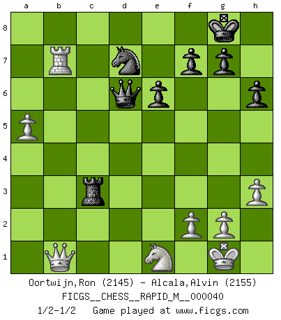 Last move : 1/2-1/2 2011 April 2 1:21:10 [Event "FICGS__CHESS__RAPID_M__000040"] [Site "FICGS"] [Date "2011.01.26"] [Round "1"] [White "Oortwijn,Ron"] [Black "Alcala,Alvin"] [Result "1/2-1/2"] [WhiteElo "2145"] [BlackElo "2155"] 1.d4 Nf6 2.c4 c6 3.Nf3 d5 4.Nc3 e6 5.Bg5 h6 6.Bxf6 Qxf6 7.e3 Bd6 8.Bd3 Nd7 9.O-O Qe7 10.c5 Bc7 11.e4 dxe4 12.Nxe4 O-O 13.Qc2 Rb8 14.Rfe1 Rd8 15.b4 b6 16.Rab1 a5 17.bxa5 bxc5 18.Rxb8 Nxb8 19.Nxc5 Bxa5 20.Rb1 Bc7 21.Be4 Bd6 22.Ne5 Bxe5 23.dxe5 Qc7 24.h3 Qxe5 25.a4 Kf8 26.Bf3 Ke7 27.Nd3 Qd6 28.Rb3 Nd7 29.Bxc6 Ba6 30.Bb5 Rc8 31.Qb1 Kf8 32.a5 Bxb5 33.Rxb5 Kg8 34.Rb7 Rc3 35.Ne1 1/2-1/2 Queen's pawn game Kingside Castling by player White (move 9) Kingside Castling by player Black (move 12) This chess game ended in a draw. Follow this game move after move (download)When you don't know what to do, wait for your opponent to get an idea - it's sure to be wrong. (Tarrasch) Rauchen ist dem Schachspieler bei seiner Arbeit, also im Wettkampf, untersagt. (Viktor Kortschnoi) Creo que una cierta cantidad de temperamento es esperada de los genios del Ajedrez. (Ron Gross) La victoire dans une partie d'Echecs appartient la plupart du temps à celui qui voit un peu plus loin que l'adversaire. (Lasker) Logic : The art of thinking and reasoning in strict accordance with the limitations and incapacities of the human misunderstanding. (Ambrose Bierce)