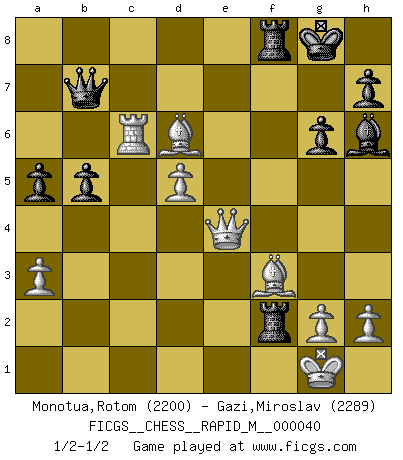 Last move : 1/2-1/2 2011 May 27 13:5:29 [Event "FICGS__CHESS__RAPID_M__000040"] [Site "FICGS"] [Date "2011.01.26"] [Round "1"] [White "Monotua,Rotom"] [Black "Gazi,Miroslav"] [Result "1/2-1/2"] [WhiteElo "2200"] [BlackElo "2289"] 1.d4 Nf6 2.c4 c5 3.d5 e6 4.Nc3 exd5 5.cxd5 d6 6.e4 g6 7.Nf3 Bg7 8.Bf4 O-O 9.Nd2 Ng4 10.Be2 Ne5 11.O-O f5 12.a3 Na6 13.Nc4 Nxc4 14.Bxc4 Nc7 15.Qd2 b5 16.Ba2 c4 17.Rfe1 fxe4 18.Bg5 e3 19.Qxe3 Qd7 20.Qd2 Rf7 21.b3 cxb3 22.Bxb3 Na6 23.Rac1 Nc5 24.Bd1 Qb7 25.Ne4 Nxe4 26.Rxe4 Bd7 27.Bf4 Raf8 28.Bg3 Qa6 29.Qb4 Bh6 30.Rc2 Qb7 31.Bxd6 Bf5 32.Rc6 a5 33.Qe1 Bxe4 34.Qxe4 Rxf2 35.Bf3 1/2-1/2 Benoni : Classical with e4 and Nf3 Kingside Castling by player Black (move 8) Kingside Castling by player White (move 11) This chess game ended in a draw. Follow this game move after move (download)Bobby is the finest Chess player this country ever produced. His memory for the moves, his brilliance in dreaming up combinations, and his fierce determination to win are uncanny. (John Collins) Schach ist Kampf, hauptsächlich jedoch gegen die eigenen Fehler. (Savielly Grigorievitsch Tartakower) Sin errores no puede haber brillantez. (Emanuel Lasker) Les erreurs sont comme les malheurs, elles n'arrivent jamais seules. (Siegbert Tarrasch) Computers have lots of memory but no imagination. (Anonymous)