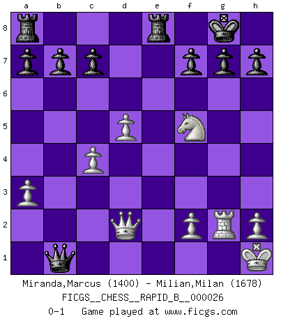 Last move : 0-1 2007 February 1 17:13:30 [Event "FICGS__CHESS__RAPID_B__000026"] [Site "FICGS"] [Date "2006.12.06"] [Round "1"] [White "Miranda,Marcus"] [Black "Milian,Milan"] [Result "0-1"] [WhiteElo "1400"] [BlackElo "1678"] 1.e4 e5 2.Nf3 Nf6 3.Nxe5 d6 4.Nf3 Nxe4 5.d4 d5 6.Bd3 Nc6 7.O-O Be7 8.c4 Nb4 9.Be2 O-O 10.Nc3 Be6 11.Be3 Bf5 12.a3 Nc6 13.Nxd5 Bd6 14.Bf4 Bxf4 15.Nxf4 Ng5 16.d5 Nxf3+ 17.Bxf3 Ne5 18.b3 Qd6 19.Nh5 Qg6 20.Ng3 Bc2 21.Qe1 Nxf3+ 22.gxf3 Bd3 23.Qd2 Bxf1 24.Rxf1 Rfe8 25.Kh1 Qf6 26.Rg1 Qxf3+ 27.Rg2 Qxb3 28.Nf5 Qb1+ 0-1 Petrov : Classical attack Kingside Castling by player White (move 7) Kingside Castling by player Black (move 9) Player Black won this chess game. Follow this game move after move (download)Do you realize Fischer almost never has any bad pieces? He exchanges them, and the bad pieces remain with his opponents. (Yuri Balashov) Man kann eine Schachpartie nur gewinnen, wenn das Gleichgewicht gestört ist. In einer Stellung mit ungestörtem Gleichgewicht ist auch das größte Genie hilflos - in der Stellung steckt dann eben kein genialer Einfall. (Wilhelm Steinitz) Nunca antes ha habido un jugador de Ajedrez con tal conocimiento a fondo de las complejidades del juego y una inmensa voluntad absolutamente indomable de ganar. Yo pienso que Fischer es el jugador mas grande que jamás haya existido. (Lisa Lane) Même un GMI sait rarement calculer sur plus de cinq coups une attaque à sacrifices. (Rudolf Spielmann) The only thing that overcomes hard luck is hard work. (Harry Golden)