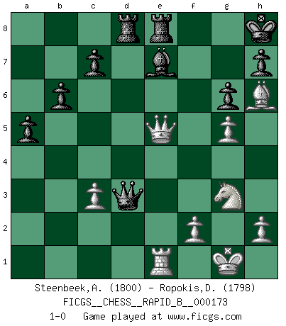 Last move : 1-0 2011 February 14 13:40:36 [Event "FICGS__CHESS__RAPID_B__000173"] [Site "FICGS"] [Date "2011.01.27"] [Round "1"] [White "Steenbeek,Adri"] [Black "Ropokis,Dimitrios"] [Result "1-0"] [WhiteElo "1800"] [BlackElo "1798"] 1.e4 e5 2.Nf3 Nf6 3.Nxe5 d6 4.Nf3 Nxe4 5.d4 d5 6.Bd3 Nc6 7.O-O Be7 8.c4 Nb4 9.Be2 O-O 10.Nc3 Bf5 11.a3 Nxc3 12.bxc3 Nc6 13.Re1 Re8 14.cxd5 Qxd5 15.Bf4 Rac8 16.Bd3 Qd7 17.Rb1 Bxd3 18.Qxd3 b6 19.Re3 Bxa3 20.Ng5 g6 21.Ne4 Be7 22.Rbe1 Qf5 23.Bh6 Rcd8 24.Qe2 a5 25.g4 Qe6 26.g5 Ne5 27.dxe5 Qf5 28.e6 fxe6 29.Ng3 Qf4 30.Rf3 Qd6 31.Rd3 Qxd3 32.Qxe6+ Kh8 33.Qe5+ 1-0 Petrov : Classical attack Kingside Castling by player White (move 7) Kingside Castling by player Black (move 9) Player White won this chess game. Follow this game move after move (download)The winner of the game is the player who makes the next-to-last mistake. (Savielly Tartakover) Es gibt keine einzige Frau, der ich nicht einen Springer vorgeben könnte und trotzdem gewänne. (Robert James Fischer) El Ajedrez es la vida. (Bobby Fischer) Même un GMI sait rarement calculer sur plus de cinq coups une attaque à sacrifices. (Rudolf Spielmann) Now be brave and don't look back. Don't look back. (Shmi Skywalker in Star Wars ep.1)
