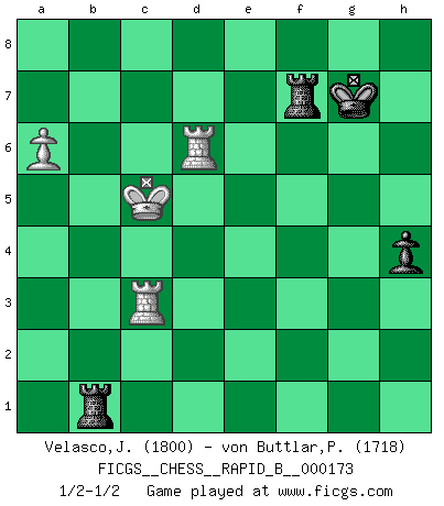 Last move : 1/2-1/2 2011 February 5 10:27:43 [Event "FICGS__CHESS__RAPID_B__000173"] [Site "FICGS"] [Date "2011.01.27"] [Round "1"] [White "Velasco,Jose Maria"] [Black "von Buttlar,Paul"] [Result "1/2-1/2"] [WhiteElo "1800"] [BlackElo "1718"] 1.e4 e6 2.d4 d5 3.Nc3 Nf6 4.Bg5 Be7 5.e5 Nfd7 6.Bxe7 Qxe7 7.f4 O-O 8.Nf3 c5 9.Qd2 Nc6 10.dxc5 Qxc5 11.O-O-O f6 12.Bd3 Nb6 13.exf6 Rxf6 14.Kb1 Nc4 15.Bxc4 Qxc4 16.g3 Bd7 17.Rhe1 Be8 18.b3 Qb4 19.Nd4 Nxd4 20.Qxd4 Qxd4 21.Rxd4 a6 22.Kb2 Rc8 23.g4 Bf7 24.g5 Rf5 25.Nd1 Bh5 26.Rxe6 Bxd1 27.Rxd1 Rxf4 28.Rd2 Rf5 29.Re7 b5 30.Ra7 Rc6 31.Re2 Kf8 32.h4 h6 33.gxh6 gxh6 34.Rd7 Rf4 35.Rh2 d4 36.h5 Ke8 37.Ra7 Rf5 38.Ka3 Rfc5 39.Rg2 Kf8 40.R2g7 Rxc2 41.Rh7 Kg8 42.Rhd7 Rf2 43.Kb4 Re6 44.Rxd4 Re5 45.Rxa6 Rxh5 46.Rb6 Kg7 47.a3 Rf3 48.a4 bxa4 49.bxa4 Rf7 50.a5 Rh1 51.R4d6 Rg1 52.a6 h5 53.Kc5 h4 54.Rb3 Rc1+ 55.Kb6 Ra1 56.Rc3 Rb1+ 57.Kc5 1/2-1/2 French : Classical, Steinitz variation Kingside Castling by player Black (move 7) Queenside Castling by player White (move 11) 10 pieces endgame at move 45 : White KRRPP , Black KRRPP WHITE : King + 2 Rooks 2 Pawns BLACK : King + 2 Rooks 2 Pawns 9 pieces endgame at move 48 : White KRRP , Black KRRPP WHITE : King + 2 Rooks 1 Pawn BLACK : King + 2 Rooks 2 Pawns 8 pieces endgame at move 49 : White KRRP , Black KRRP WHITE : King + 2 Rooks 1 Pawn BLACK : King + 2 Rooks 1 Pawn This chess game ended in a draw. Follow this game move after move (download)Who is your opponent tonight, tonight I am playing against the Black pieces. (Akiba Rubinstein) Schach wird sich dank seiner hohen kulturellen Tradition immer durchsetzen. In näherer Zukunft womöglich sogar als Gegenreaktion auf die maßlose Reizüberflutung im Freizeit- und Spielbereich. (Garry Kasparov) Muchos se han convertido en Maestros de Ajedrez, nadie se ha convertido en el Maestro del Ajedrez. (Siegbert Tarrasch) Les échecs sont plus proches de l'art de l'assassinat que de l'art de la guerre. (Arturo Perez-Reverte) Experiences are the keys to life. (Daniel Parmet)