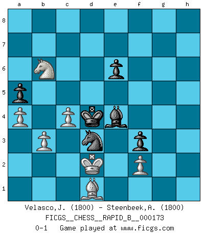 Last move : 0-1 2011 February 21 11:0:37 [Event "FICGS__CHESS__RAPID_B__000173"] [Site "FICGS"] [Date "2011.01.27"] [Round "1"] [White "Velasco,Jose Maria"] [Black "Steenbeek,Adri"] [Result "0-1"] [WhiteElo "1800"] [BlackElo "1800"] 1.d4 d5 2.c4 c6 3.Nf3 Nf6 4.Nc3 e6 5.e3 Nbd7 6.a4 Bd6 7.Be2 a5 8.O-O O-O 9.Qc2 Re8 10.h3 Qe7 11.Rd1 b6 12.e4 Nxe4 13.Nxe4 dxe4 14.Qxe4 Bb7 15.Bg5 f6 16.Bf4 Bxf4 17.Qxf4 c5 18.Qe3 Rad8 19.b3 g6 20.h4 f5 21.h5 Qf6 22.dxc5 Nxc5 23.Qe5 Qxe5 24.Nxe5 Be4 25.hxg6 hxg6 26.Rxd8 Rxd8 27.Rd1 Rxd1+ 28.Bxd1 g5 29.g3 f4 30.gxf4 gxf4 31.Kf1 Kg7 32.Ke2 Kf6 33.Ng4+ Kg5 34.Ne5 Kf5 35.Nf7 Kf6 36.Nd6 Ke5 37.Nc8 Kd4 38.Kd2 Nd3 39.Nxb6 f3 0-1 QGD Slav : 4.Nc3 Kingside Castling by player White (move 8) Kingside Castling by player Black (move 8) Player Black won this chess game. Follow this game move after move (download)Chess is war over the board. The object is to crush the opponents mind. (Bobby Fischer) Mein Name ist Rustam Kamsky. Sie haben meinen Sohn belästigt. Bereiten Sie sich aufs Sterben vor. (Rustam Kamsky) Yo siempre he tenido un ligero sentimiento de lástima por una persona que no tiene conocimiento del Ajedrez. (Siegbert Tarrasch) En blitz, le Cavalier l'emporte sur le Fou. (Vlastimil Hort) Inventor: A person who makes an ingenious arrangement of wheels, levers and springs, and believes it civilization. (Ambrose Bierce, The Devil's Dictionary)