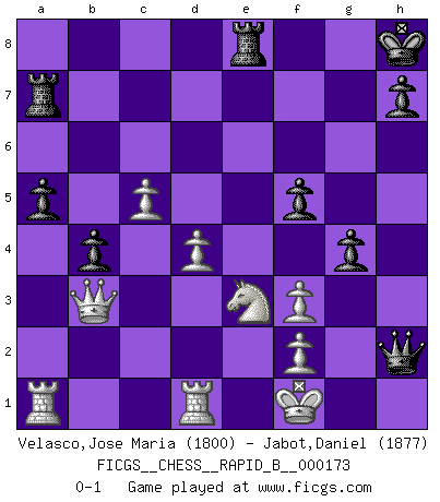 Last move : 0-1 2011 February 22 9:46:52 [Event "FICGS__CHESS__RAPID_B__000173"] [Site "FICGS"] [Date "2011.01.27"] [Round "1"] [White "Velasco,Jose Maria"] [Black "Jabot,Daniel"] [Result "0-1"] [WhiteElo "1800"] [BlackElo "1877"] 1.d4 d5 2.c4 c6 3.Nf3 dxc4 4.e3 b5 5.a4 e6 6.axb5 cxb5 7.b3 Bb4+ 8.Bd2 Bxd2+ 9.Nbxd2 a5 10.bxc4 b4 11.Ne5 Nf6 12.c5 O-O 13.Ndc4 Nd5 14.Bd3 g6 15.h4 f6 16.Nf3 Ba6 17.h5 g5 18.O-O Nc6 19.Qc2 Ra7 20.Rfe1 Qe8 21.h6 Qh5 22.Nb6 g4 23.Nd2 Bxd3 24.Qxd3 f5 25.Qb5 Nde7 26.d5 exd5 27.Nxd5 Qxh6 28.Nf4 Rb8 29.Qc4+ Kh8 30.Qb3 Ne5 31.Nc4 N7c6 32.Red1 Nf3+ 33.Kf1 Ncd4 34.exd4 Re8 35.Ne3 Qxf4 36.gxf3 Qh2 0-1 QGD Slav : 3.Nf3 Kingside Castling by player Black (move 12) Kingside Castling by player White (move 18) Player Black won this chess game. Follow this game move after move (download)I have added these principles to the law: get the Knights into action before both Bishops are developed. (Emanuel Lasker) Im Schach gewinnt jeder. Hat man Freunde am Spiel - und das ist die Hauptsache - ist auch der Verlust einer Partie kein Unglück. (David Bronstein) En manos de Fischer's, una diminuta ventaja teórica es tan buena como tener una Reina de ventaja. (Isaac Kashdan) Comme les marins qui ont mille raisons différentes d'aller en mer, les joueurs d'échecs en ont tout autant avant de s'installer devant une table et jouer... (Vincent Bertignac, philosophe) The only thing that matters is the evidence. (Horatio Caine, C.S.I. Miami)