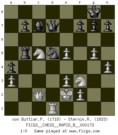 Last move : 1-0 2011 March 3 10:45:28 [Event "FICGS__CHESS__RAPID_B__000173"] [Site "FICGS"] [Date "2011.01.27"] [Round "1"] [White "von Buttlar,Paul"] [Black "Sternik,Ryszard"] [Result "1-0"] [WhiteElo "1718"] [BlackElo "1833"] 1.c4 e5 2.Nc3 Nf6 3.Nf3 Nc6 4.e3 Bb4 5.Qc2 d6 6.d3 O-O 7.Bd2 Bc5 8.a3 Bg4 9.Be2 Re8 10.b4 Bb6 11.h3 Bf5 12.g4 Be6 13.g5 Nd7 14.h4 Bg4 15.Rg1 Bh5 16.Ne4 a5 17.b5 Ne7 18.Bc3 d5 19.cxd5 Nxd5 20.Bb2 a4 21.Nfd2 Bxe2 22.Kxe2 Re6 23.Qc4 Nf8 24.Nf3 c6 25.Bxe5 Ng6 26.d4 cxb5 27.Qxb5 Bc7 28.Rgd1 Ra5 29.Qb2 Rb6 30.Qd2 Rab5 31.Rdc1 Nxe5 32.dxe5 Rb2 33.Rc2 Rxc2 34.Qxc2 Qd7 35.Rd1 Rb5 36.Nc5 1-0 English Opening Kingside Castling by player Black (move 6) Player White won this chess game. Follow this game move after move (download)Chess is a part of culture and if a culture is declining then Chess too will decline. (Mikhail Botvinnik) Es gibt Leute, die glauben, alles wäre vernünftig, was man mit einem ernsthaften Gesicht tut. (Georg Christoph Lichtenberg) El Ajedrez es una manera fabulosa para que los niños aprendan a autovalorarse y a autoestimarse. (Saudin Robovic) La vie est comme un jeu d'échecs : nous esquissons un plan, mais celui-ci est tributaire de ce que daignent faire l'adversaire aux échecs et le destin dans la vie. (Arthur Schopenhauer) He who is a good ruler must first have been ruled. (Aristotle)