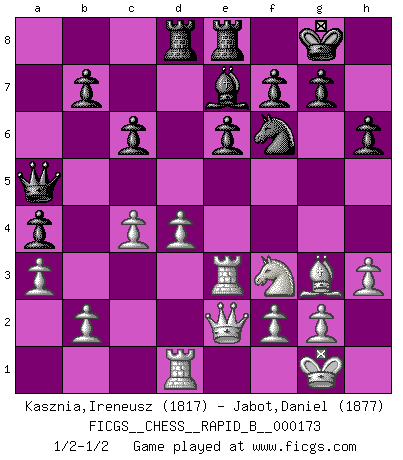 Last move : 1/2-1/2 2011 February 25 9:49:37 [Event "FICGS__CHESS__RAPID_B__000173"] [Site "FICGS"] [Date "2011.01.27"] [Round "1"] [White "Kasznia,Ireneusz"] [Black "Jabot,Daniel"] [Result "1/2-1/2"] [WhiteElo "1817"] [BlackElo "1877"] 1.d4 d5 2.c4 c6 3.e3 Nf6 4.Nf3 Bf5 5.Bd3 Bxd3 6.Qxd3 e6 7.Nc3 Nbd7 8.O-O Bb4 9.Bd2 a5 10.a3 Be7 11.Rfe1 O-O 12.e4 dxe4 13.Nxe4 Nxe4 14.Qxe4 Nf6 15.Qe2 a4 16.Bf4 Qa5 17.Ne5 Rad8 18.Rad1 Nd7 19.Nf3 Qf5 20.Bg3 Nf6 21.h3 Rfe8 22.Bc7 Rc8 23.Bh2 Rcd8 24.Rd3 Qa5 25.Red1 h6 26.Re3 Bf8 27.Be5 Be7 28.Rb1 Nd7 29.Bh2 Qf5 30.Rd1 Nf6 31.Bg3 Qa5 1/2-1/2 QGD Slav defense Kingside Castling by player White (move 8) Kingside Castling by player Black (move 11) This chess game ended in a draw. Follow this game move after move (download)Whoever sees no other aim in the game than that of giving checkmate to one's opponent will never become a good Chess player. (Euwe) Ich liebe den Moment, wenn ich das Ego meines Gegenüber breche. (Robert James Fischer) Fischer sacrificó virtualmente todo lo que la mayoría de nosotros los 'debiles' (término que él usa) valoramos, respetamos y apreciamos por el amor de un astuto, a menudo hermoso tablero de juego, por el privilegio ambivalente de ser su mas grande maestro. (Paul Kollar) Des idées, des idées, j'en ai cent, j'en ai mille. Des bonnes, des mauvaises, applicables, irréalisables... Il suffit de faire le tri ! (Roos) Now you put water in a cup, it becomes the cup; You put water into a bottle it becomes the bottle; You put it in a teapot it becomes the teapot. Water can flow or it can crash. Be water, my friend. (Bruce Lee)