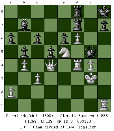 Last move : 1-0 2011 February 20 18:27:8 [Event "FICGS__CHESS__RAPID_B__000173"] [Site "FICGS"] [Date "2011.01.27"] [Round "1"] [White "Steenbeek,Adri"] [Black "Sternik,Ryszard"] [Result "1-0"] [WhiteElo "1800"] [BlackElo "1833"] 1.e4 e5 2.Nf3 Nc6 3.Bb5 a6 4.Ba4 Nf6 5.O-O Nxe4 6.d4 b5 7.Bb3 d5 8.dxe5 Be6 9.Nbd2 Nc5 10.c3 Nxb3 11.Nxb3 Be7 12.Nfd4 Qd7 13.Nxc6 Qxc6 14.Be3 O-O 15.f4 Qd7 16.Bc5 Rfe8 17.h3 Bf5 18.Bxe7 Rxe7 19.Qd4 Qc6 20.Nc5 Rd8 21.g4 Bc8 22.f5 Qh6 23.Kg2 Qh4 24.b4 Rde8 25.Rae1 c6 26.Re3 g6 27.e6 fxe6 28.f6 Rf7 29.Nd3 Ref8 30.Ref3 Qg5 31.Rf4 Bb7 32.Kg3 Qh6 33.Ne5 Kh8 34.h4 g5 35.hxg5 Qxg5 36.Rh1 1-0 Ruy Lopez : Open, 7.Bb3 Kingside Castling by player White (move 5) Kingside Castling by player Black (move 14) Player White won this chess game. Follow this game move after move (download)Chess is a terrible game. If you have no center, your opponent has a freer position. If you do have a center, then you really have something to worry about ! (Siegbert Tarrasch) Ein guter Spieler hat immer Glück. (José Raúl Capablanca) El Ajedrez es la vida. (Bobby Fischer) Aux échecs, les retours au sommet sont rares : les dommages psychologiques consécutifs à une défaite sont trop sévères. (Daily Telegraph) They say in chess you've got to kill the queen, and then you mate it... Oh I, do you ? (Red Hot Chili Peppers, Fortune faded)