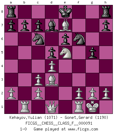 Last move : 1-0 2011 February 3 12:0:19 [Event "FICGS__CHESS__CLASS_F__000091"] [Site "FICGS"] [Date "2011.01.30"] [Round "1"] [White "Kehayov,Yulian"] [Black "Gonet,Gerard"] [Result "1-0"] [WhiteElo "1071"] [BlackElo "1190"] 1.e4 Nc6 2.d4 d5 3.Nc3 e6 4.Nf3 Bb4 5.e5 Bxc3+ 6.bxc3 f6 7.Bd3 Bd7 8.Rb1 fxe5 9.Nxe5 Nf6 10.Ba3 g5 11.O-O Qe7 12.Bxe7 1-0 KP : Nimzovich defense, Bogolyubov variation Kingside Castling by player White (move 11) Player White won this chess game. Follow this game move after move (download)Nowadays, when you're not a grandmaster at 14, you can forget about it. (Anand Viswanathan) Das Schach ist nichts für kleine Geister, es beansprucht einen vollen Mann, der sich nicht sklavisch an das Überlieferte hält, sondern selbständig die Tiefen des Spiels zu ergründen sucht. (Wilhelm Steinitz) Yo siempre he tenido un ligero sentimiento de lástima por una persona que no tiene conocimiento del Ajedrez. (Siegbert Tarrasch) Les Cavaliers se révèlent fort utiles dans les positions fermées. D'habitude, les Fous sont un peu plus forts que les Cavaliers dans les positions ouvertes. Qu'on le veuille ou non, il restera toujours des exceptions ! Luck has a peculiar habit of favoring those who don't depend on it. (Author unknown)