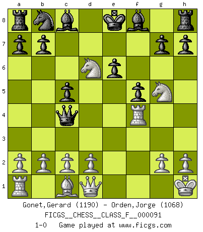 Last move : 1-0 2011 February 3 17:23:49 [Event "FICGS__CHESS__CLASS_F__000091"] [Site "FICGS"] [Date "2011.01.30"] [Round "1"] [White "Gonet,Gerard"] [Black "Orden,Jorge"] [Result "1-0"] [WhiteElo "1190"] [BlackElo "1068"] 1.f4 d5 2.Nf3 c5 3.e4 dxe4 4.Ng5 Nf6 5.Bc4 e6 6.Nc3 Nd5 7.Ncxe4 Nxf4 8.O-O Qd4+ 9.Kh1 Qxc4 10.Rxf4 f5 11.Nd6+ 1-0 Bird's Opening Kingside Castling by player White (move 8) Player White won this chess game. Follow this game move after move (download)You sit at the board and suddenly your heart leaps. Your hand trembles to pick up the piece and move it. But what Chess teaches you is that you must sit there calmly and think about whether it's really a good idea and whether there are other better ideas. (Stanley Kubrick) Jede Eröffnung ist gut genug um gespielt zu werden, wenn nur ihr Ruf schlecht genug ist. (Savielly Grigorievitsch Tartakower) Hay dos clases de hombres: aquellos que se conforman en dejarse llevar por las circunstancias y que juegan barajas y aquellos decididos a controlar las circunstancias y que juegan al Ajedrez. (Mortimer Collins) Je ne suis pas le dernier à jouer lâchement des coups douteux pendant le zeïtnot de l'adversaire pour l'achever: en effet les coups qui font le plus peur sont ceux que l'on ne comprend pas. Je me fais souvent peur quand je joue. (Un professeur anonyme) It is not enough to be a good player... you must also play well. (Siegbert Tarrasch)