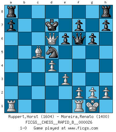 Last move : 1-0 2006 December 25 13:55:22 [Event "FICGS__CHESS__RAPID_B__000026"] [Site "FICGS"] [Date "2006.12.06"] [Round "1"] [White "Ruppert,Horst"] [Black "Moreira,Renato"] [Result "1-0"] [WhiteElo "1604"] [BlackElo "1400"] 1.d4 d5 2.c4 dxc4 3.Nf3 Nf6 4.e3 b5 5.a4 Ba6 6.axb5 Bxb5 7.Nc3 c6 8.b3 Nd5 9.Nxb5 cxb5 10.bxc4 bxc4 11.Bxc4 e6 12.Bb5+ Nd7 13.Ne5 N5b6 14.O-O Be7 15.Nc6 Qc7 16.Nxe7 Kxe7 17.Ba3+ Ke8 18.Qg4 g6 19.Qe4 Qd8 20.Bc5 Nd5 21.Qe5 Qf6 22.Bxd7+ Kxd7 23.Qd6+ 1-0 QGA, 4.e3 Kingside Castling by player White (move 14) Player White won this chess game. Follow this game move after move (download)There are two types of sacrifices: correct ones and mine. (Mikhail Tal) Im Schach nämlich geht es darum, daß Ich des Gegners klein zu kriegen, sein Ego zu zerbrechen und zu zermahlen, seine Selbstachtung zu zertreten und zu verscharren und seine ganze mißachtenswerte sogenannte Persönlichkeit ein für alle Mal tot zu hacken und zu zerstampfen und dadurch die menschliche Gesellschaft von einer stinkenden Pestbeule zu befreien. Es ist ein königliches Spiel. (Robert James Fischer) La enorme capacidad mental, en la que sin ella no puede un jugador de Ajedrez existir, es demasiado requerida por el Ajedrez al grado de que nunca podrá liberar su mente de este juego. (Albert Einstein) On croit qu'il y a plus de mauvais joueurs que de bons joueurs, c'est faux : Il y a autant de joueurs qui gagnent que de joueurs qui perdent. (Philippe Geluck) When you've done things right people won't know you've done anything at all. (Futurama)