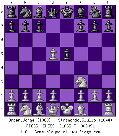 Last move : 1-0 2011 March 14 0:14:51 [Event "FICGS__CHESS__CLASS_F__000091"] [Site "FICGS"] [Date "2011.01.30"] [Round "1"] [White "Orden,Jorge"] [Black "Stramondo,Giulio"] [Result "1-0"] [WhiteElo "1068"] [BlackElo "1044"] 1.e4 e5 2.Nf3 d5 3.exd5 1-0 This chess game has been lost on time (started : 2011.01.30 8:23:45) QP counter-gambit (elephant gambit) Player White won this chess game. Follow this game move after move (download)Those who say they understand Chess, understand nothing. (Robert Hubner) Herr Iljumschinow ist ein etwas merkwürdiger Geschäftsmann: Er arbeitet zusammen mit Leuten wie Muammar al-Gaddafi; früher ist das Saddam Hussein gewesen. (Joel Lautier) Uno no tiene que jugar muy bien, es suficiente jugar mejor que el oponente. (Siegbert Tarrasch) Aidez vos pièces, elles vous aideront. (Paul Morphy) I've never seen so many men wasted so badly. (Blondie in The Good, The Bad and The Ugly)