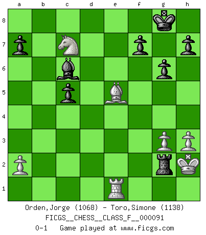 Last move : 0-1 2011 February 15 15:40:31 [Event "FICGS__CHESS__CLASS_F__000091"] [Site "FICGS"] [Date "2011.01.30"] [Round "1"] [White "Orden,Jorge"] [Black "Toro,Simone"] [Result "0-1"] [WhiteElo "1068"] [BlackElo "1138"] 1.e4 e5 2.Nf3 Nc6 3.Nc3 Nf6 4.Be2 Bc5 5.O-O Ng4 6.h3 Nxf2 7.Rxf2 Bxf2+ 8.Kxf2 O-O 9.d4 Nxd4 10.Nxd4 exd4 11.Qxd4 Re8 12.Bf3 Qh4+ 13.Kg1 d6 14.Qf2 Qf6 15.Kh1 b6 16.e5 Rxe5 17.Nd5 Qe6 18.Nxc7 Re1+ 19.Kh2 Qe5+ 20.g3 Rb8 21.Bf4 Qc5 22.Qxc5 bxc5 23.Rxe1 Bd7 24.Bxd6 g6 25.Na8 Rxb2 26.Be5 Rxc2+ 27.Bg2 Bc6 28.Nc7 Rxg2+ 0-1 Four knights game Kingside Castling by player White (move 5) Kingside Castling by player Black (move 8) Player Black won this chess game. Follow this game move after move (download)A thorough understanding of the typical mating continuations makes the most complicated sacrificial combinations leading up to them not only not difficult, but almost a matter of course. (Siegbert Tarrasch) Bogoljubow: Matt in vier Zügen! Tartakower: Ich verbitte mir jede Belästigung! (Savielly Grigorievitsch Tartakower) Muchos se han convertido en Maestros de Ajedrez, nadie se ha convertido en el Maestro del Ajedrez. (Siegbert Tarrasch) Votre seul travail dans les ouvertures est d'obtenir un milieu de partie jouable. (Lajos Portish) There is a computer disease that anybody who works with computers knows about. It's a very serious disease and it interferes completely with the work. The trouble with computers is that you 'play' with them ! (Richard P. Feynman)