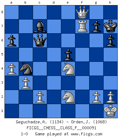 Last move : 1-0 2011 March 23 14:9:34 [Event "FICGS__CHESS__CLASS_F__000091"] [Site "FICGS"] [Date "2011.01.30"] [Round "1"] [White "Geguchadze,Alexander"] [Black "Orden,Jorge"] [Result "1-0"] [WhiteElo "1134"] [BlackElo "1068"] 1.e4 c5 2.Nf3 d6 3.d4 cxd4 4.Nxd4 Nf6 5.Nc3 a6 6.Be2 e6 7.a4 Be7 8.O-O O-O 9.f4 h6 10.Be3 Nc6 11.Bf3 Qc7 12.Qe1 e5 13.Nde2 b6 14.Rd1 Nb4 15.Rd2 Bb7 16.Qf2 Rad8 17.Bxb6 Qc4 18.Bxd8 Rxd8 19.Kh1 Bxe4 20.fxe5 dxe5 21.b3 Qc6 22.Bxe4 Nxe4 23.Rxd8+ Bxd8 24.Qxf7+ Kh7 25.Qf5+ Kg8 26.Nxe4 Bc7 27.Qf8+ Kh7 28.Rf7 1-0 Sicilian : Najdorf, Opovcensky variation Kingside Castling by player White (move 8) Kingside Castling by player Black (move 8) Player White won this chess game. Follow this game move after move (download)It began to feel as though you were playing against Chess itself. - On playing against Robert Fischer. (Walter Shipman) Schach ist ein Teil der Kultur, und wenn es mit der Kultur abwärts geht, geht es auch mit dem Schach abwärts. (Mikhail Moiseyevich Botvinik) Debes de llevar a tu oponente hacia un profundo y obscuro bosque donde 2+2=5, y el camino que conduce a la salida es suficientemente ancho para solamente uno. (Mikhail Tal) Le moment que je préfère le plus dans une rencontre, c'est celui où je sens que la personnalité de l'adversaire se brise. (Robert Fischer) A government big enough to give you everything you want is strong enough to take everything you have. (Thomas Jefferson)