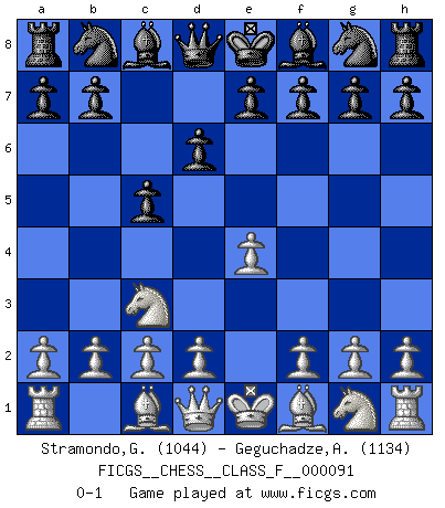 Last move : 0-1 2011 March 15 12:21:45 [Event "FICGS__CHESS__CLASS_F__000091"] [Site "FICGS"] [Date "2011.01.30"] [Round "1"] [White "Stramondo,Giulio"] [Black "Geguchadze,Alexander"] [Result "0-1"] [WhiteElo "1044"] [BlackElo "1134"] 1.e4 c5 2.Nc3 d6 0-1 This chess game has been lost on time (started : 2011.01.30 8:23:45) Sicilian : Closed Player Black won this chess game. Follow this game move after move (download)Fischer Chess play was always razor-sharp, rational and brilliant. One of the best ever. (Dave Regis) Ich kenne Menschen, die allen Willen der Welt besitzen und doch nicht Schach spielen können. (Robert James Fischer) ¿Esta Bobby Fischer algo cuerdo?. (Salo Flohr) Les échecs, c'est la lutte contre l'erreur. (Johannes Zukertort) If you are good, you will be assigned all the work. If you are really good, you will get out of it. (Dan Rotaru)