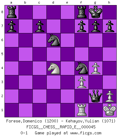 Last move : 0-1 2011 February 20 16:58:9 [Event "FICGS__CHESS__RAPID_E__000045"] [Site "FICGS"] [Date "2011.01.30"] [Round "1"] [White "Forese,Domenico"] [Black "Kehayov,Yulian"] [Result "0-1"] [WhiteElo "1200"] [BlackElo "1071"] 1.b4 e5 2.Nf3 e4 3.Ne5 d6 4.Nc4 Be6 5.Na5 Qc8 6.c4 Qd7 7.Nxb7 Bxc4 8.Na3 d5 9.d3 exd3 10.exd3 Ba6 11.Rb1 Bxb7 12.d4 Nc6 13.Be2 Bxb4+ 14.Bd2 Bxd2+ 15.Qxd2 Bc8 16.O-O Nge7 17.Qe3 O-O 18.Rbc1 Nf5 19.Qg5 Ncxd4 20.Bd3 Qd6 21.Rc3 Ba6 22.Bxa6 Qxa6 23.g4 Ne2+ 24.Kg2 Nxc3 25.Nc2 Nd6 26.Qe5 Ne2 27.Qxd5 Nf4+ 28.Kg1 Nxd5 29.Nd4 Nf4 30.f3 Qxa2 31.Kh1 Qg2+ 0-1 Polish (Sokolsky) opening Kingside Castling by player White (move 16) Kingside Castling by player Black (move 17) Player Black won this chess game. Follow this game move after move (download)Why must I lose to this idiot ? (Aron Nimzovich) Der Vorposten provoziert a) eine Basis für neue Angriffe und b) eine Schwächung der gegnerischen Widerstandskraft in der fraglichen Linie. (Aaron Nimzowitsch) El jugador táctico debe saber que hacer cuando algo se debe de hacer. El estratégico debe saber que hacer cuando nada se debe de hacer. (Savielly Tartakover) Il (Jacob Murray) ne joue pas pour le bon coup, mais pour le meilleur. (Eloi Relange) Life doesn't imitate art, it imitates bad television. (Woody Allen)