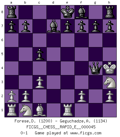 Last move : 0-1 2011 February 15 14:47:4 [Event "FICGS__CHESS__RAPID_E__000045"] [Site "FICGS"] [Date "2011.01.30"] [Round "1"] [White "Forese,Domenico"] [Black "Geguchadze,Alexander"] [Result "0-1"] [WhiteElo "1200"] [BlackElo "1134"] 1.e4 c5 2.c3 d5 3.Bb5+ Bd7 4.Bd3 dxe4 5.Bxe4 Bc6 6.Qf3 Nf6 7.d3 Nxe4 8.dxe4 Nd7 9.Nh3 Ne5 10.Qf4 Nd3+ 11.Kd2 Nxf4 12.Ke3 Qd3+ 13.Kxf4 Qxe4+ 14.Kg3 Qxg2+ 15.Kh4 Bd7 16.Re1 Qg4+ 0-1 Sicilian : Alapin's variation (2.c3) Player Black won this chess game. Follow this game move after move (download)Good positions don't win games, good moves do. (Gerald Abrahams) Die meiste Zeit treffe ich auf Gegner, die meine Enkel sein könnten. Ich bin da, um ihnen zu zeigen, dass sie von mir noch einiges lernen können. (Viktor Kortschnoi) Combinaciones deslumbrantes son para la mayoría, mover madera es para los pocos. (Georg Kieninger) Il vaut mieux sacrifier les pièces de l'adversaire. (Xavier Tartacover) Children in the dark cause accidents, accidents in the dark cause children. (Unknown)