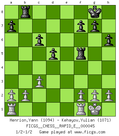 Last move : 1/2-1/2 2011 February 14 18:26:22 [Event "FICGS__CHESS__RAPID_E__000045"] [Site "FICGS"] [Date "2011.01.30"] [Round "1"] [White "Henrion,Yann"] [Black "Kehayov,Yulian"] [Result "1/2-1/2"] [WhiteElo "1094"] [BlackElo "1071"] 1.e4 e5 2.Nf3 d6 3.d4 Nf6 4.dxe5 Nxe4 5.exd6 Bxd6 6.Qe2 Qe7 7.Bg5 Nxg5 8.Nxg5 Qxe2+ 9.Bxe2 O-O 10.O-O h6 11.Ne4 Bf5 12.Nxd6 cxd6 13.c3 Nc6 14.Nd2 Rfe8 15.Bf3 Rab8 16.Bxc6 bxc6 17.Nc4 d5 18.Nd6 Re5 19.Nxf5 Rxf5 1/2-1/2 Philidor : Nimzovich variation Kingside Castling by player Black (move 9) Kingside Castling by player White (move 10) This chess game ended in a draw. Follow this game move after move (download)Help your pieces so they can help you. (Paul Morphy) Ich tröste mich mit dem Vergnügen, daß Schachfans, Zuschauer und Leser glücklich sind, wenn ein Großmeister etwas riskiert, statt nur Klötzchen zu schieben. (Mikhail Nekhemyevich Tal) La caracteristica mas importante en la posición del Ajedrez es la actividad de las piezas. Esto es absolutamente fundamental en todas las fases del juego: Apertura, Juego Medio y especialmente Finales. La limitación primordial en la actividad de una pieza, es la estructuración de los Peones. (Michael Stean) Il n'y a pas eu de défaite parce que je ne crois pas que cet ordinateur ait jamais existé. IBM a triché en refusant d'imprimer les modes de recherche de la machine. C'est évident, pendant le match, des coups décisifs ont été joués par des êtres humains. Aujourd'hui, les meilleurs spécialistes en informatique ne peuvent toujours pas expliquer comment Deep-Blue a pu jouer contre la logique des ordinateurs. IBM a gagné une guerre de communication, mais ils sont incapables de prouver que l'ordinateur a gagné tout seul. (Garry Kasparov) War is the child of passion, passion is the child of narcissism and narcissism is the child. (...) Another game ? (Thibault de Vassal)