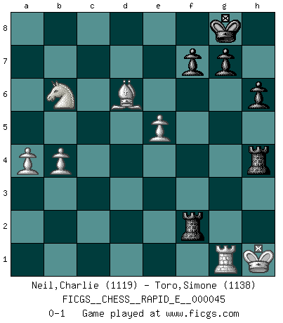 Last move : 0-1 2011 February 26 11:30:1 [Event "FICGS__CHESS__RAPID_E__000045"] [Site "FICGS"] [Date "2011.01.30"] [Round "1"] [White "Neil,Charlie"] [Black "Toro,Simone"] [Result "0-1"] [WhiteElo "1119"] [BlackElo "1138"] 1.e4 e5 2.Nf3 Nc6 3.d4 exd4 4.Nxd4 Nxd4 5.Qxd4 Nf6 6.Bg5 Be7 7.Nc3 h6 8.Bh4 O-O 9.Bd3 Re8 10.O-O b6 11.Bg3 Bb7 12.Nb5 d6 13.Rfe1 Nd7 14.Rad1 Bf6 15.Qc4 Ne5 16.Qxc7 Bc8 17.Qxd8 Rxd8 18.Bc4 Nxc4 19.Rxd6 Nxd6 20.Bxd6 Ba6 21.Nc7 Rac8 22.e5 Bg5 23.Nxa6 Rxc2 24.b4 Rd2 25.a4 Be7 26.Bxe7 Rd1 27.Kf1 R8d5 28.Bd6 R1d2 29.Nc7 R5d3 30.Nb5 Ra2 31.Nxa7 R3d2 32.Nc8 Rxf2+ 33.Kg1 Rxg2+ 34.Kh1 Rxh2+ 35.Kg1 Rhg2+ 36.Kh1 Rg4 37.Nxb6 Rf2 38.Rg1 Rh4+ 0-1 Scotch game Kingside Castling by player Black (move 8) Kingside Castling by player White (move 10) Player Black won this chess game. Follow this game move after move (download)The winner of the game is the player who makes the next-to-last mistake. (Savielly Tartakover) Ich las kürzlich ein Buch von Nietzsche. Er sagte Religion verdumme nur die Menschen. Ich stimme zu. (Robert James Fischer) Un mal plan es mejor que no tener ningún plan. (Frank Marshall) Même un GMI sait rarement calculer sur plus de cinq coups une attaque à sacrifices. (Rudolf Spielmann) There is a great deal of difference between an eager man who wants to read a book and a tired man who wants a book to read. (G.K. Chesterton)