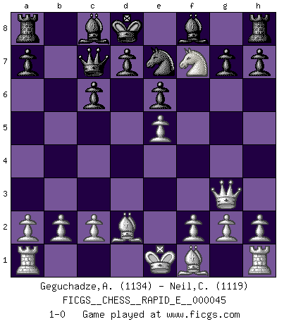 Last move : 1-0 2011 February 14 20:0:58 [Event "FICGS__CHESS__RAPID_E__000045"] [Site "FICGS"] [Date "2011.01.30"] [Round "1"] [White "Geguchadze,Alexander"] [Black "Neil,Charlie"] [Result "1-0"] [WhiteElo "1134"] [BlackElo "1119"] 1.e4 c5 2.Nf3 Nc6 3.d4 cxd4 4.Nxd4 Nf6 5.Nc3 e6 6.Nxc6 bxc6 7.e5 Ng8 8.Qf3 Bb4 9.Bd2 Qc7 10.Qg3 Bf8 11.Ne4 Ne7 12.Nd6+ Kd8 13.Nxf7+ 1-0 Sicilian defense Player White won this chess game. Follow this game move after move (download)Winning isn't everything... but losing is nothing. (Mednis) Obendrein hat der FIDE-Präsident den Revolutionsführer Gaddafi zum »Großmeister« ernannt, am Ende der WM. Das ist lächerlich! (Joel Lautier) Botvinnik trató de alejar el misterio referente al Ajedrez, siempre relacionandolo a situaciones de la vida diaria. Solía llamar al Ajedrez un problema inexacto típico, similar a aquellos en que la gente tiene siempre que resolver a cada día. (Garry Kasparov) Je ne crois pas en la psychologie, je crois aux bons coups. (Robert Fischer) He who is a good ruler must first have been ruled. (Aristotle)