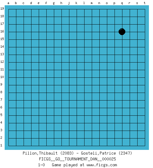 Last move : 1-0 2011 March 28 1:52:11 [Event "FICGS__GO__TOURNAMENT_DAN__000025"] [Site "FICGS"] [Date "2011.01.31"] [Round "1"] [Black "Pillon,Thibault"] [White "Gosteli,Patrice"] [Result "1-0"] [Rating 1 "2083"] [Rating 2 "2347"] 1.q16 1-0 This go game has been lost on time (started : 2011.01.31 10:30:59) Here are the names of the openings (joseki) played in the four corners : Player Black won this Go (weiqi, baduk) game. Follow this game move after move (download)Don't defend - extend ! (Bill Taylor) It is a good thing for an uneducated man to read books of quotations. (Winston Churchill)