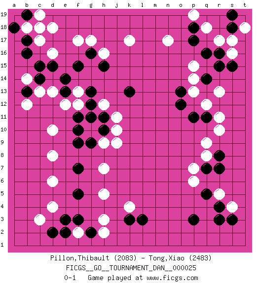 Last move : 0-1 2011 March 16 13:17:6 [Event "FICGS__GO__TOURNAMENT_DAN__000025"] [Site "FICGS"] [Date "2011.01.31"] [Round "1"] [Black "Pillon,Thibault"] [White "Tong,Xiao"] [Result "0-1"] [Rating 1 "2083"] [Rating 2 "2483"] 1.q16 d4 2.r4 d16 3.p3 r10 4.r8 r13 5.r15 n17 6.p17 k17 7.f3 d6 8.d2 c3 9.k3 d10 10.b16 b14 11.c15 c17 12.d15 d13 13.f15 f17 14.b17 h16 15.c18 d18 16.a18 c19 17.b19 b18 18.c14 c13 19.c18 h3 20.f5 h5 21.f7 k4 22.l3 h7 23.f9 d8 24.f11 g10 25.f10 f13 26.g9 b18 27.b13 b12 28.c18 h9 29.h10 j9 30.g11 b18 31.q11 r11 32.c18 f2 33.e3 b18 34.h15 q12 35.p11 h12 36.c18 j10 37.h11 j11 38.g2 b18 39.g16 g17 40.c18 h2 41.e2 b18 42.e14 c18 43.e13 e12 44.g13 f12 45.g12 s4 46.s3 r5 47.r3 q8 48.r7 q9 49.q5 p6 50.q7 p7 51.o12 p15 52.q14 p13 53.o13 p14 54.k13 r17 55.r16 q18 56.p18 s16 57.s18 s17 58.s15 t18 59.s19 p19 0-1 Here are the names of the openings (joseki) played in the four corners : Corner q16 : q16 r13 Hoshi (Hwajeom, Seongjeom, Xingwei`) 4-4 Point. The star or hoshi (4-4) point, emphasizing influence at the potential expense of territory. Niken Kakari (Dukan Keolch'im, E`r Gua`jiao~, 2-Space Low Approach). Black typically answers by 7-3 or 3-5 (which is not joseki). Corner d4 : d4 f3 Hoshi (Hwajeom, Seongjeom, Xingwei`) 4-4 Point. The star or hoshi (4-4) point, emphasizing influence at the potential expense of territory. Ikken Kakari (Hankan Keolch'im, Yi Gua`jiao~, 1-Space Low Approach). Black 2 is the standard approach move to the 4-4. Corner d16 : d16 b16 Hoshi (Hwajeom, Seongjeom, Xingwei`) 4-4 Point. The star or hoshi (4-4) point, emphasizing influence at the potential expense of territory. Player White won this Go (weiqi, baduk) game. Follow this game move after move (download)Nothing requires doing this or that, but necessity exists. (Pierre Audouard) Work expands to fill the time available. (C. Northcote Parkinson, in Parkinson's Laws)
