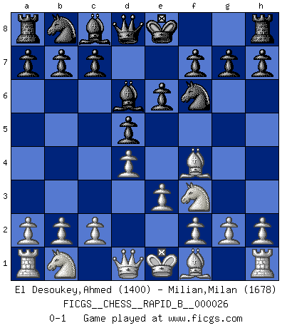 Last move : 0-1 2007 January 12 5:45:51 [Event "FICGS__CHESS__RAPID_B__000026"] [Site "FICGS"] [Date "2006.12.06"] [Round "1"] [White "El Desoukey,Ahmed"] [Black "Milian,Milan"] [Result "0-1"] [WhiteElo "1400"] [BlackElo "1678"] 1.d4 d5 2.Nf3 Nf6 3.Bf4 e6 4.e3 Bd6 0-1 This chess game has been lost on time (started : 2006.12.06 15:23:3) Queen's Bishop game Player Black won this chess game. Follow this game move after move (download)The hardest game to win is a won game. (Emanuel Lasker) Mein Gehirn das ist mein zweitwichtigstes Organ [Aus dem Film: Der Schläfer]. (Woody Allen) Si tu oponente no puede hacer nada activo, entonces no apures la posición; En vez de eso, dejalo estar sentado ahí, sufriendo y rogandote por un empate. (Jeremy Silman) Les échecs sont un jeu terrible. Si vous n'avez pas le centre, votre adversaire a une position plus libre. Par contre, si vous avez le centre, alors vous avez vraiment quelque chose pour laquelle vous inquiéter ! (Siegbert Tarrasch) There are two types of people in this world, good and bad. The good sleep better, but the bad seem to enjoy the waking hours much more. (Woody Allen)